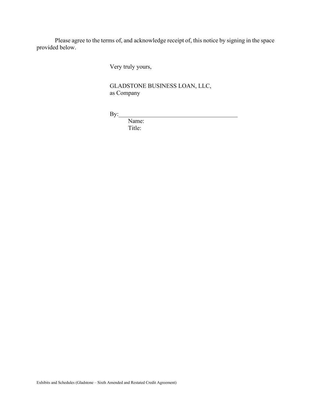 Exhibits and Schedules (Gladstone – Sixth Amended and Restated Credit Agreement) Please agree to the terms of, and acknowledge receipt of, this notice by signing in the space provided below. Very truly yours, GLADSTONE BUSINESS LOAN, LLC, as Company By:_______________________________________ Name: Title: