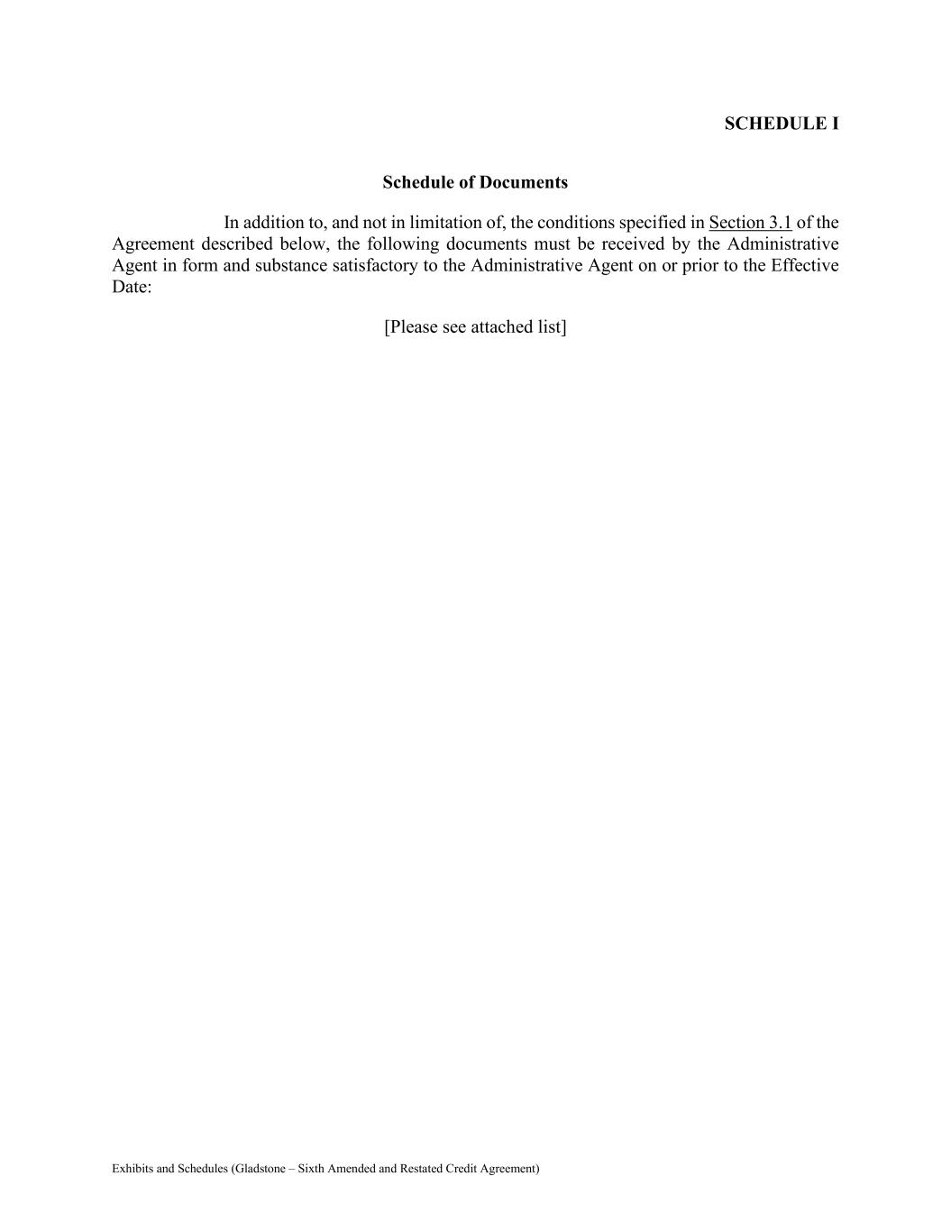 Exhibits and Schedules (Gladstone – Sixth Amended and Restated Credit Agreement) SCHEDULE I Schedule of Documents In addition to, and not in limitation of, the conditions specified in Section 3.1 of the Agreement described below, the following documents must be received by the Administrative Agent in form and substance satisfactory to the Administrative Agent on or prior to the Effective Date: [Please see attached list]