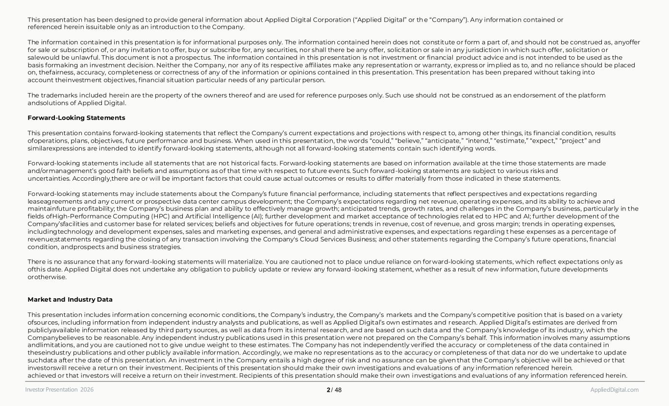 This presentation has been designed to provide general information about Applied Digital Corporation (“Applied Digital” or th e “Company”). Any information contained or referenced herein issuitable only as an introduction to the Company.​​ The information contained in this presentation is for informational purposes only. The information contained herein does not constitute or form a part of, and should not be construed as, anyoffer for sale or subscription of, or any invitation to offer, buy or subscribe for, any securities, nor shall there be any offer, solicitation or sale in any jurisdiction in which such offer, solicitation or salewould be unlawful. This document is not a prospectus. The information contained in this presentation is not investment or financial product advice and is not intended to be used as the basis formaking an investment decision. Neither the Company, nor any of its respective affiliates make any representation or warranty, express or implied as to, and no reliance should be placed on, thefairness, accuracy, completeness or correctness of any of the information or opinions contained in this presentation. This presentation has been prepared without taking into account theinvestment objectives, financial situation particular needs of any particular person.​​ The trademarks included herein are the property of the owners thereof and are used for reference purposes only. Such use should not be construed as an endorsement of the platform andsolutions of Applied Digital.​​ Forward-Looking Statements​​ This presentation contains forward-looking statements that reflect the Company’s current expectations and projections with respect to, among other things, its financial condition, results ofoperations, plans, objectives, future performance and business. When used in this presentation, the words “could,” “believe,” “anticipate,” “intend,” “estimate,” “expect,” “project” and similarexpressions are intended to identify forward-looking statements, although not all forward-looking statements contain such identifying words. Forward-looking statements include all statements that are not historical facts. Forward-looking statements are based on information available at the time those statements are made and/ormanagement’s good faith beliefs and assumptions as of that time with respect to future events. Such forward-looking statements are subject to various risks and uncertainties. Accordingly,there are or will be important factors that could cause actual outcomes or results to differ materially from those indicated in these statements.​​ Forward-looking statements may include statements about the Company’s future financial performance, including statements that reflect perspectives and expectations regarding leaseagreements and any current or prospective data center campus development; the Company’s expectations regarding net revenue, operating expenses, and its ability to achieve and maintainfuture profitability; the Company’s business plan and ability to effectively manage growth; anticipated trends, growth rates, and ch allenges in the Company’s business, particularly in the fields ofHigh-Performance Computing (HPC) and Artificial Intelligence (AI); further development and market acceptance of technologies relat ed to HPC and AI; further development of the Company’sfacilities and customer base for related services; beliefs and objectives for future operations; trends in revenue, cost of revenue, and gross margin; trends in operating expenses, includingtechnology and development expenses, sales and marketing expenses, and general and administrative expenses, and expectations regarding t hese expenses as a percentage of revenue;statements regarding the closing of any transaction involving the Company's Cloud Services Business; and other statements regarding the Company’s future operations, financial condition, andprospects and business strategies.​​ There is no assurance that any forward-looking statements will materialize. You are cautioned not to place undue reliance on forward-looking statements, which reflect expectations only as ofthis date. Applied Digital does not undertake any obligation to publicly update or review any forward-looking statement, whether as a result of new information, future developments orotherwise.​​ Market and Industry Data​​ This presentation includes information concerning economic conditions, the Company’s industry, the Company’s markets and the Company’s competitive position that is based on a variety ofsources, including information from independent industry analysts and publications, as well as Applied Digital’s own estimates and research. Applied Digital’s estimates are derived from publiclyavailable information released by third party sources, as well as data from its internal research, and are based on such data and the Company’s knowledge of its industry, which the Companybelieves to be reasonable. Any independent industry publications used in this presentation were not prepared on the Company’s behalf. This information involves many assumptions andlimitations, and you are cautioned not to give undue weight to these estimates. The Company has not independently verified the accuracy or completeness of the data contained in theseindustry publications and other publicly available information. Accordingly, we make no representations as to the accuracy or completeness of that data nor do we undertake to update suchdata after the date of this presentation. An investment in the Company entails a high degree of risk and no assurance can be given that the Company’s objective will be achieved or that investorswill receive a return on their investment. Recipients of this presentation should make their own investigations and evaluations of any information referenced herein.​ achieved or that investors will receive a return on their investment. Recipient