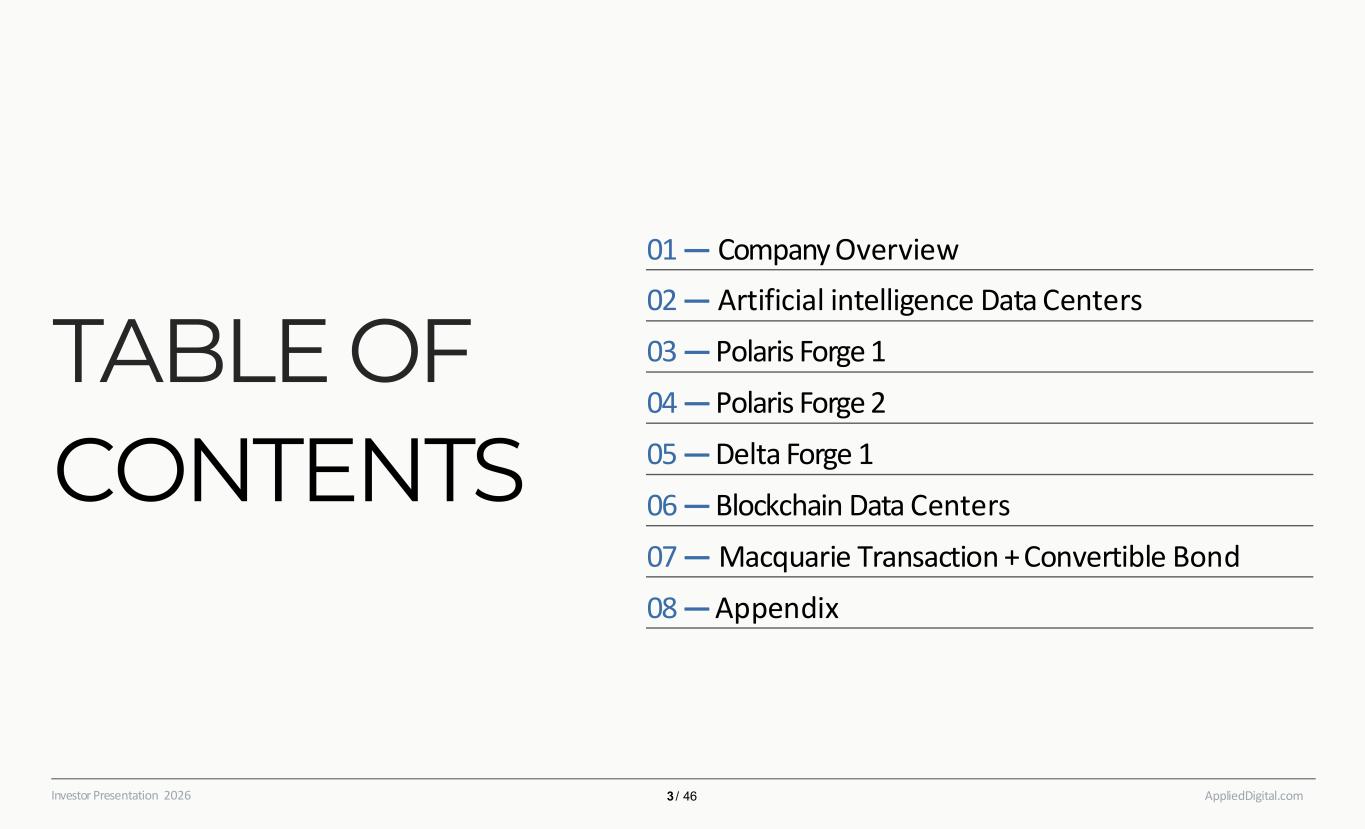 TABLE OF CONTENTS AppliedDigital.comInvestor Presentation 2026 01 — Company Overview 02 — Artificial intelligence Data Centers 03 — Polaris Forge 1 04 — Polaris Forge 2 05 — Delta Forge 1 06 — Blockchain Data Centers 07 — Macquarie Transaction +Convertible Bond 08 —Appendix 3 / 46