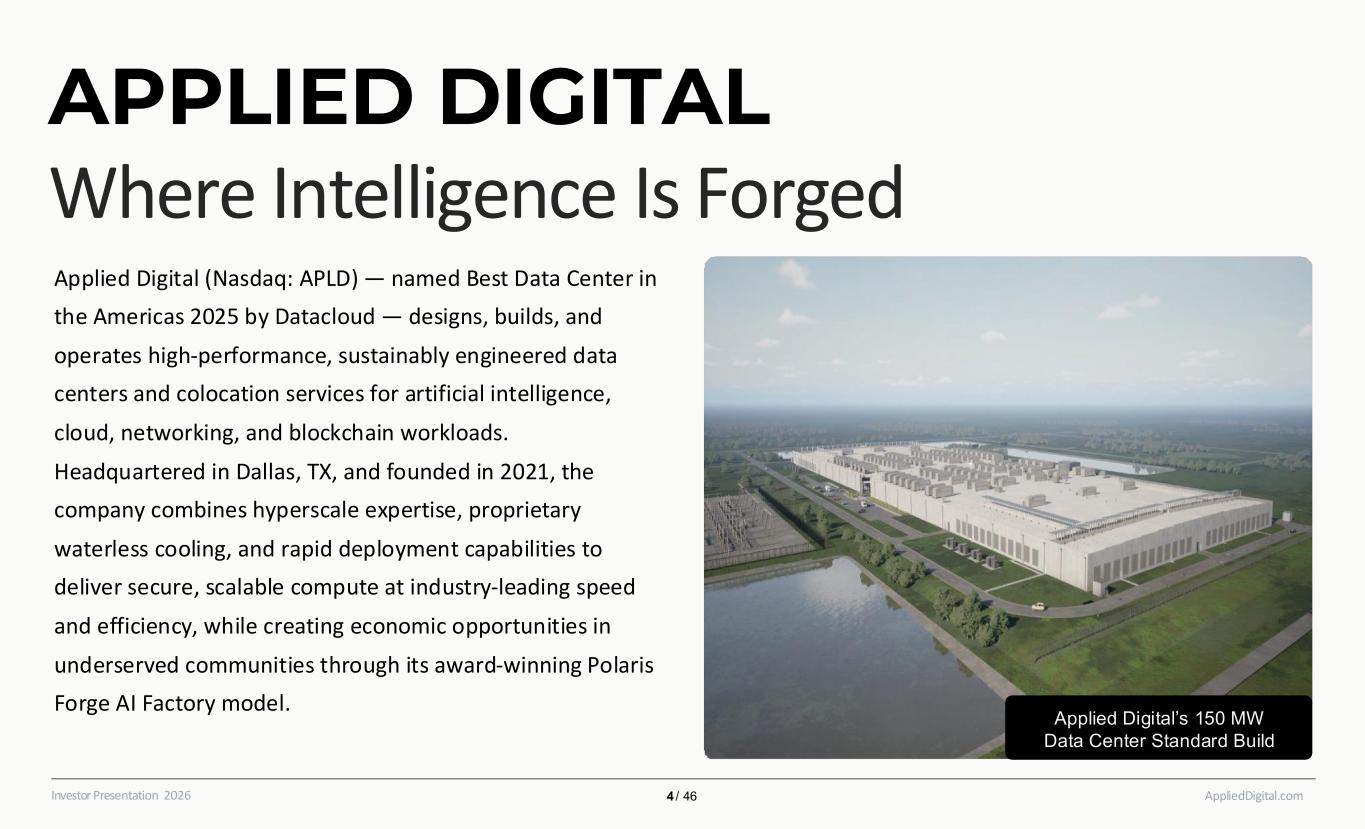 APPLIED DIGITAL Where Intelligence Is Forged AppliedDigital.comInvestor Presentation 2026 Applied Digital (Nasdaq: APLD) — named Best Data Center in the Americas 2025 by Datacloud — designs, builds, and operates high-performance, sustainably engineered data centers and colocation services for artificial intelligence, cloud, networking, and blockchain workloads. Headquartered in Dallas, TX, and founded in 2021, the company combines hyperscale expertise, proprietary waterless cooling, and rapid deployment capabilities to deliver secure, scalable compute at industry-leading speed and efficiency, while creating economic opportunities in underserved communities through its award-winning Polaris Forge AI Factory model. Applied Digital’s 150 MW Data Center Standard Build 4 / 46