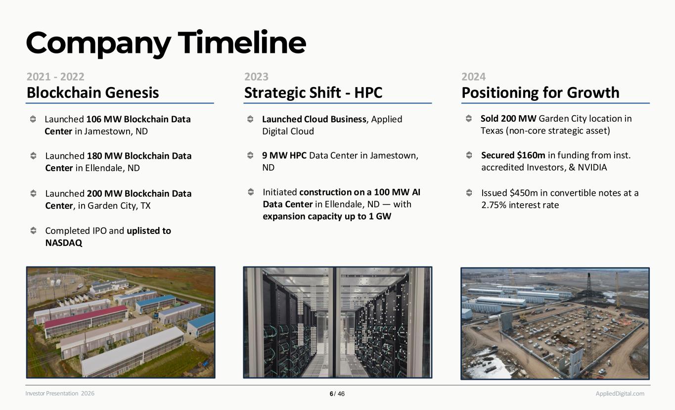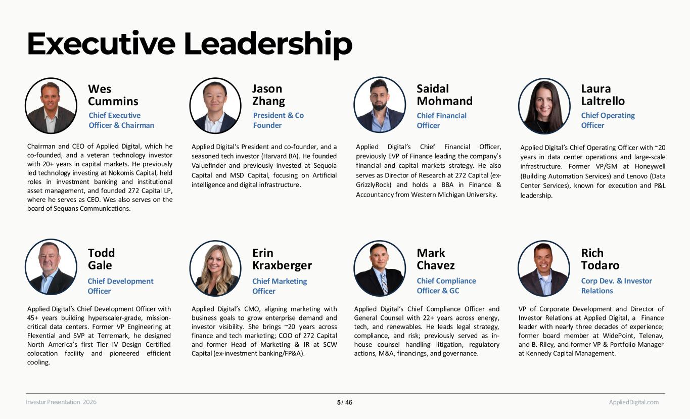 Executive Leadership AppliedDigital.comInvestor Presentation 2026 Wes Cummins Jason Zhang Applied Digital’s President and co-founder, and a seasoned tech investor (Harvard BA). He founded Valuefinder and previously invested at Sequoia Capital and MSD Capital, focusing on Artificial intelligence and digital infrastructure. Saidal Mohmand Laura Laltrello Todd Gale Erin Kraxberger Mark Chavez Rich Todaro Chairman and CEO of Applied Digital, which he co-founded, and a veteran technology investor with 20+ years in capital markets. He previously led technology investing at Nokomis Capital, held roles in investment banking and institutional asset management, and founded 272 Capital LP, where he serves as CEO. Wes also serves on the board of Sequans Communications. Applied Digital’s Chief Financial Officer, previously EVP of Finance leading the company’s financial and capital markets strategy. He also serves as Director of Research at 272 Capital (ex- GrizzlyRock) and holds a BBA in Finance & Accountancy from Western Michigan University. Applied Digital’s Chief Operating Officer with ~20 years in data center operations and large-scale infrastructure. Former VP/GM at Honeywell (Building Automation Services) and Lenovo (Data Center Services), known for execution and P&L leadership. Applied Digital’s Chief Development Officer with 45+ years building hyperscaler-grade, mission- critical data centers. Former VP Engineering at Flexential and SVP at Terremark, he designed North America’s first Tier IV Design Certified colocation facility and pioneered efficient cooling. Applied Digital’s CMO, aligning marketing with business goals to grow enterprise demand and investor visibility. She brings ~20 years across finance and tech marketing; COO of 272 Capital and former Head of Marketing & IR at SCW Capital (ex-investment banking/FP&A). Applied Digital’s Chief Compliance Officer and General Counsel with 22+ years across energy, tech, and renewables. He leads legal strategy, compliance, and risk; previously served as in- house counsel handling litigation, regulatory actions, M&A, financings, and governance. VP of Corporate Development and Director of Investor Relations at Applied Digital, a Finance leader with nearly three decades of experience; former board member at WidePoint, Telenav, and B. Riley, and former VP & Portfolio Manager at Kennedy Capital Management. Chief Executive Officer & Chairman President & Co Founder Chief Operating Officer Chief Financial Officer Chief Marketing Officer Corp Dev. & Investor Relations Chief Compliance Officer & GC Chief Development Officer 5 / 46
