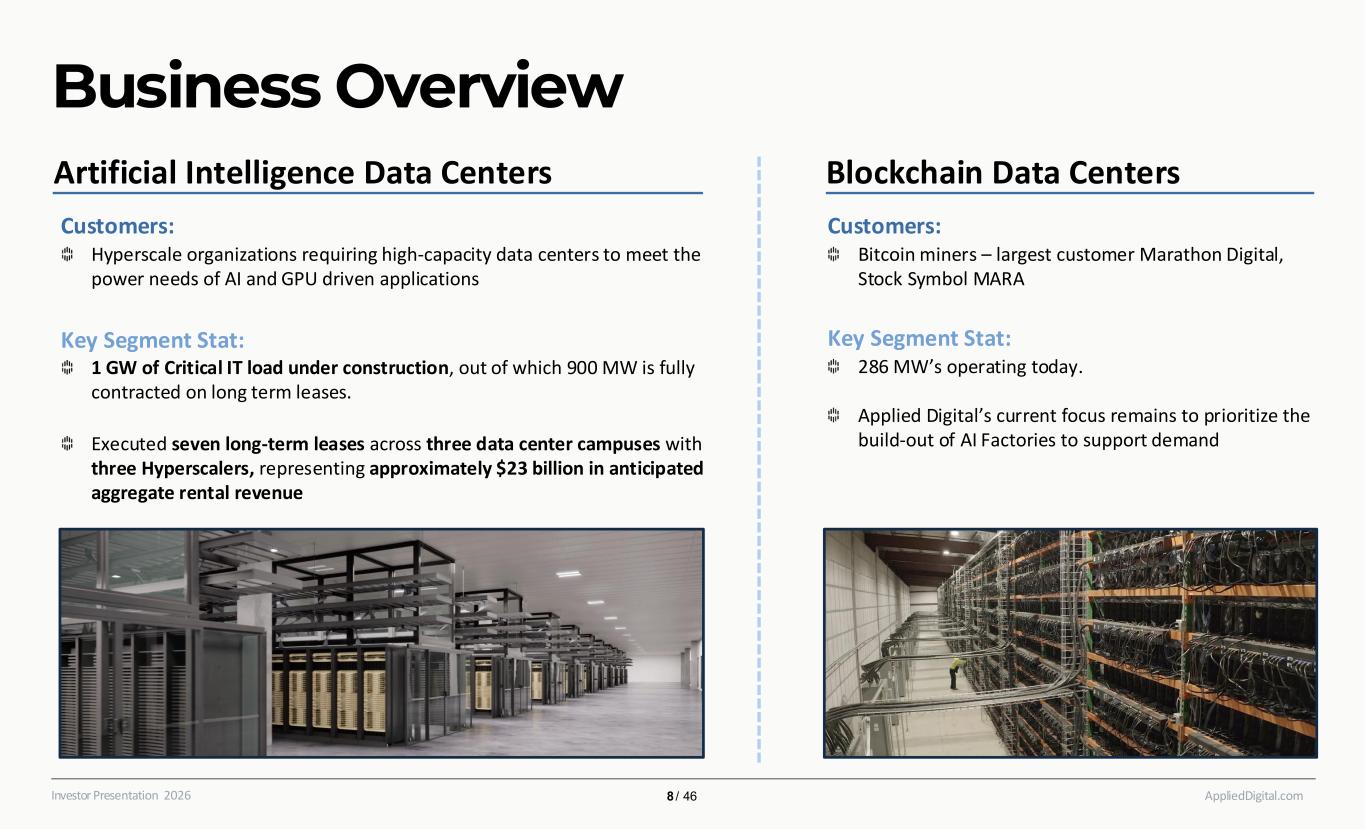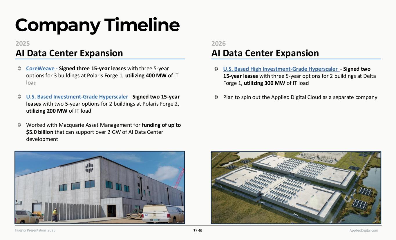 Company Timeline AppliedDigital.comInvestor Presentation 2026 7 / 46 AI Data Center Expansion 2025 AI Data Center Expansion 2026 CoreWeave - Signed three 15-year leases with three 5-year options for 3 buildings at Polaris Forge 1, utilizing 400 MW of IT load U.S. Based Investment-Grade Hyperscaler - Signed two 15-year leases with two 5-year options for 2 buildings at Polaris Forge 2, utilizing 200 MW of IT load Worked with Macquarie Asset Management for funding of up to $5.0 billion that can support over 2 GW of AI Data Center development U.S. Based High Investment-Grade Hyperscaler - Signed two 15-year leases with three 5-year options for 2 buildings at Delta Forge 1, utilizing 300 MW of IT load Plan to spin out the Applied Digital Cloud as a separate company