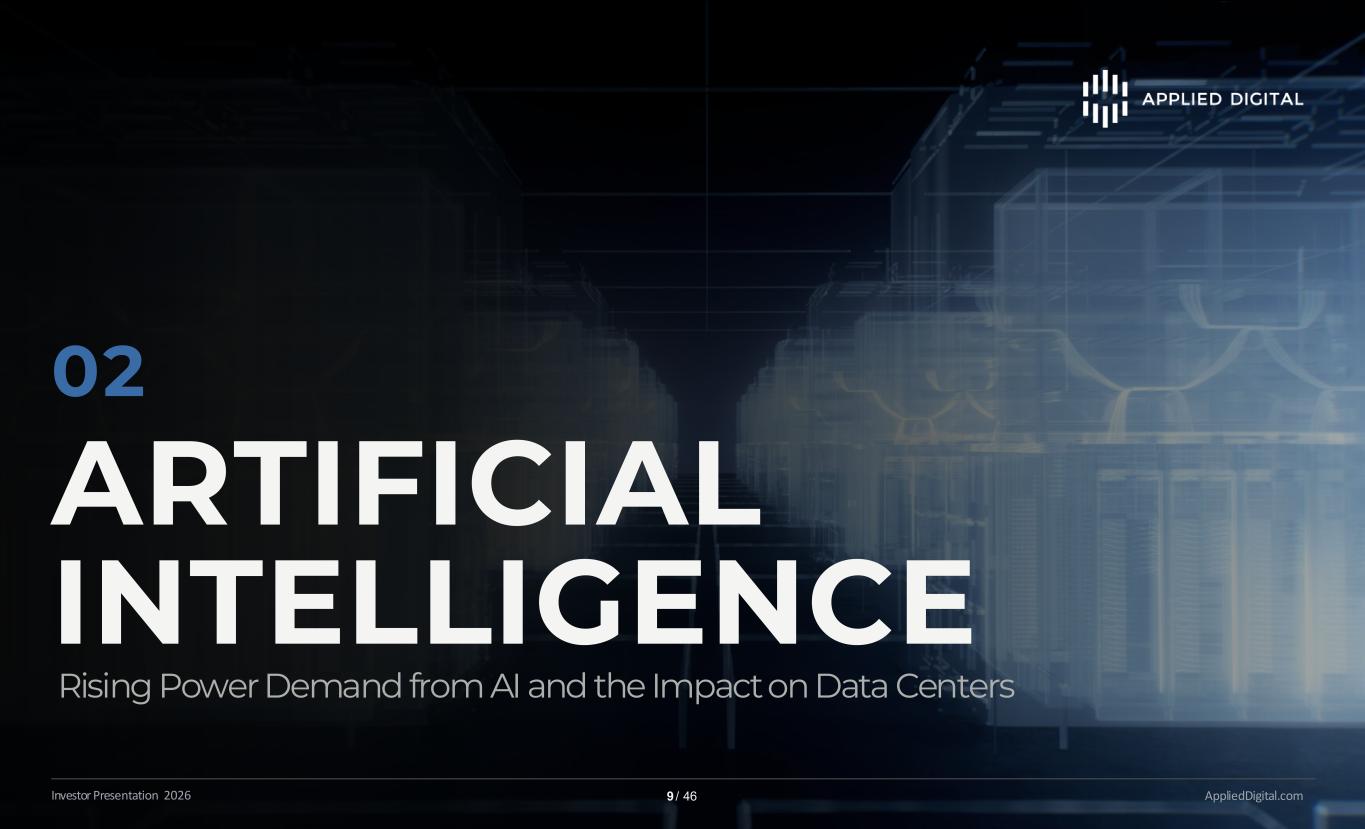 ARTIFICIAL INTELLIGENCE ARTIFICIAL INTELLIGENCE AppliedDigital.comInvestor Presentation 2026 9 / 46 02 Rising Power Demand from AI and the Impact on Data Centers