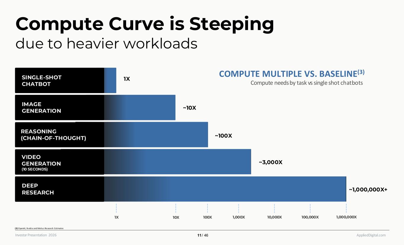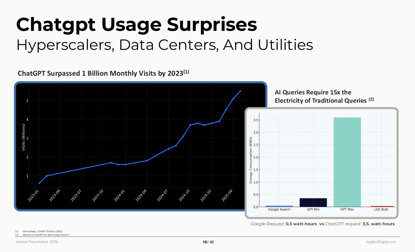 AppliedDigital.comInvestor Presentation 2026 Google Request: 0.3 watt-hours vs ChatGPT request: 3.5. watt-hours AI Queries Require 15x the Electricity of Traditional Queries (2) ChatGPT Surpassed 1 Billion Monthly Visits by 2023(1) Source: OpenAI, Nvidia and Melius Research Estimates Chatgpt Usage Surprises Hyperscalers, Data Centers, And Utilities (1) DemandSage, ChatGPT Statis tics (2025) (2) Medium, Is ChatGPT the Next Energy Guzz ler? 10 / 46
