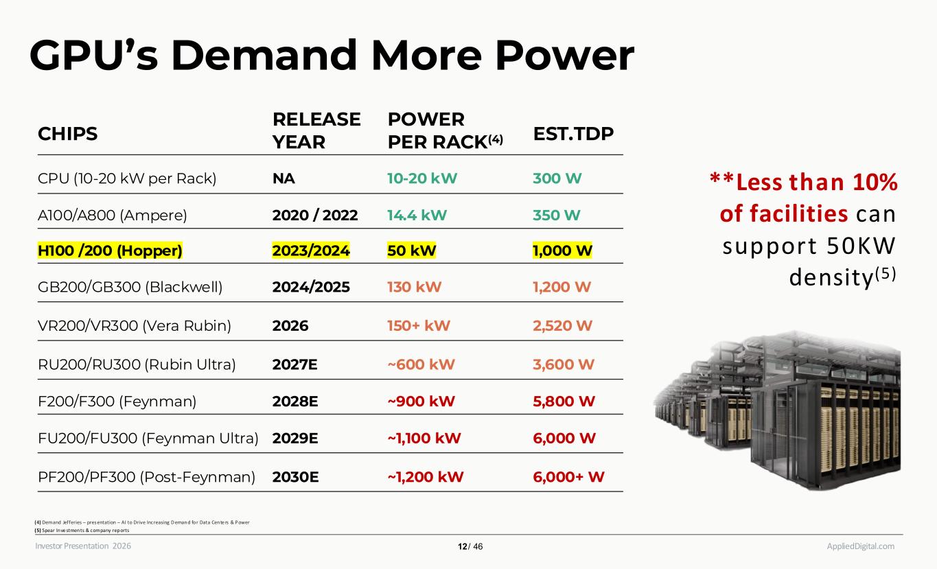 AppliedDigital.comInvestor Presentation 2026 GPU’s Demand More Power CHIPS RELEASE YEAR POWER PER RACK(4) EST.TDP CPU (10-20 kW per Rack) NA 10-20 kW 300 W A100/A800 (Ampere) 2020 / 2022 14.4 kW 350 W H100 /200 (Hopper) 2023/2024 50 kW 1,000 W GB200/GB300 (Blackwell) 2024/2025 130 kW 1,200 W VR200/VR300 (Vera Rubin) 2026 150+ kW 2,520 W RU200/RU300 (Rubin Ultra) 2027E ~600 kW 3,600 W F200/F300 (Feynman) 2028E ~900 kW 5,800 W FU200/FU300 (Feynman Ultra) 2029E ~1,100 kW 6,000 W PF200/PF300 (Post-Feynman) 2030E ~1,200 kW 6,000+ W **Less than 10% of facilities can support 50KW density(5) (4) Demand Jefferies – presentation – AI to Drive Increasing D emand for Data Cente rs & Power (5) Spear Inve stments & company reports 12 / 46