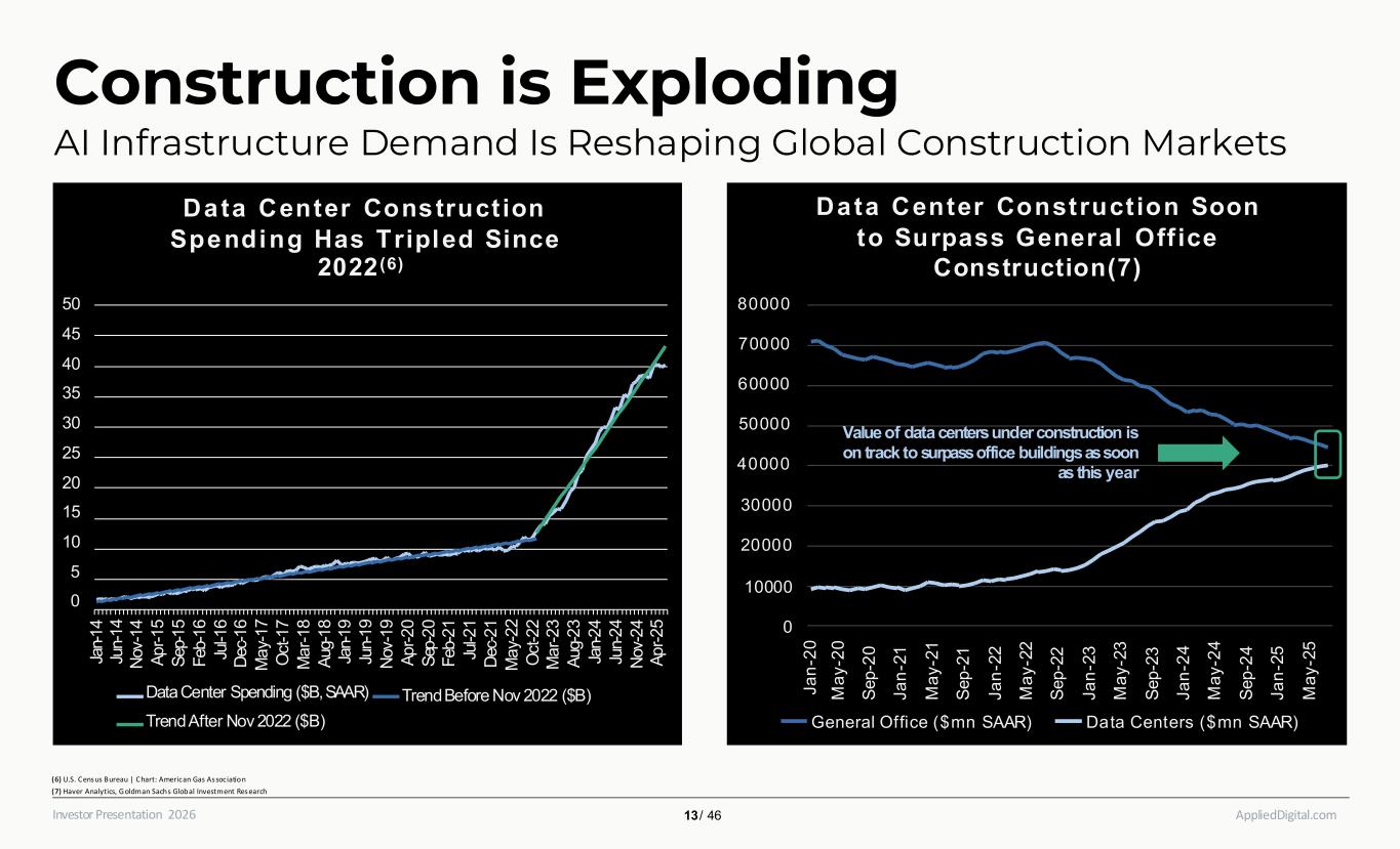 AppliedDigital.comInvestor Presentation 2026 50 45 40 35 30 25 20 15 10 5 0 Ja n- 1 4 Ju n- 1 4 N o v- 1 4 A p r- 1 5 S e p- 1 5 F e b -1 6 Ju l-1 6 D e c- 1 6 M a y- 1 7 O c t- 1 7 M a r- 1 8 A u g- 1 8 Ja n- 1 9 Ju n- 1 9 N o v- 1 9 A p r- 2 0 S ep -2 0 F e b -2 1 Ju l-2 1 D e c- 2 1 M a y- 2 2 O c t- 2 2 M a r- 2 3 A u g- 2 3 Ja n- 2 4 Ju n- 2 4 N o v- 2 4 A p r- 2 5 Data Center Construction Spending Has Tripled Since 2022 (6) TrendBefore Nov 2022 ($B)DataCenter Spending ($B,SAAR) TrendAfter Nov 2022 ($B) 30000 20000 10000 0 80000 70000 60000 50000 40000 J a n -2 0 M a y -2 0 S e p -2 0 J a n -2 1 M a y -2 1 S e p -2 1 J a n -2 2 M a y -2 2 S e p -2 2 J a n -2 3 M a y -2 3 S e p -2 3 J a n -2 4 M a y -2 4 S e p -2 4 J a n -2 5 M a y -2 5 Data Center Construct ion Soon to Surpass General Off ice Construction(7) General Office ($mn SAAR) Data Centers ($mn SAAR) Value of data centersunderconstruction is on track to surpassoffice buildingsassoon as this year Construction is Exploding AI Infrastructure Demand Is Reshaping Global Construction Markets (6) U.S. Census Bureau | Chart: American Gas Association (7) Haver Analytics, G oldman Sachs Global Investment Research 13 / 46
