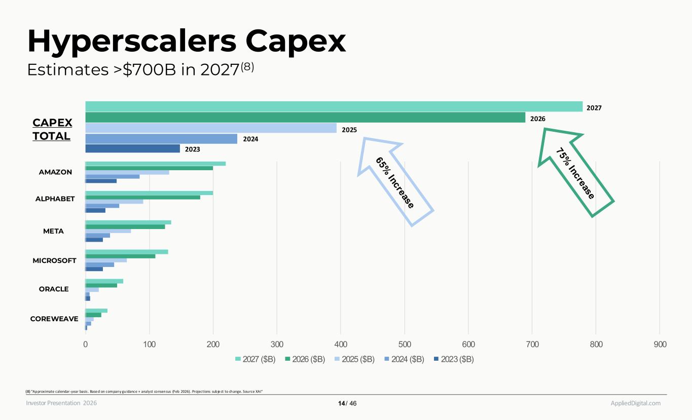 AppliedDigital.comInvestor Presentation 2026 Hyperscalers Capex Estimates >$700B in 2027(8) (8) "Approximate calendar-year basis . Base d on company guidance + analyst consensus (Feb 2026). Projections subje ct to change. Source XAI" 14 / 46 0 100 200 300 400 500 600 700 800 900 2027 ($B) 2026 ($B) 2025 ($B) 2024 ($B) 2023 ($B) AMAZON ALPHABET META MICROSOFT ORACLE COREWEAVE 2027 2026 2025 2024 2023 CAPEX TOTAL