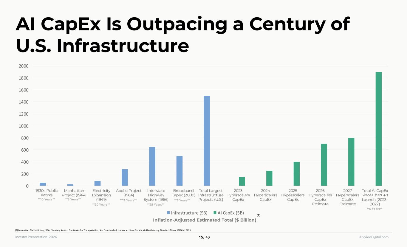 AppliedDigital.comInvestor Presentation 2026 0 200 400 600 800 1000 1200 1400 1600 1800 2000 1930s Public Works Manhattan Project (1944) Electricity Expansion (1949) Apollo Project (1964) Interstate Highway System (1966) Broadband Capex (2000) Total Largest Infrastructure Projects (U.S.) 2023 Hyperscalers CapEx 2024 Hyperscalers CapEx 2025 Hyperscalers CapEx 2026 Hyperscalers CapEx Estimate 2027 Hyperscalers CapEx Estimate Total AI CapEx Since ChatGPT Launch (2023– 2027) Infrastructure ($B) AI CapEx ($B) **10 Years** **5 Years** **20 Years** **13 Years** **25 Years** **5 Years** **5 Years** AI CapEx Is Outpacing a Century of U.S. Infrastructure Inflation-Adjusted Estimated Total ($ Billion) (9) Manhattan District History, BEA, P lanetary Society, Eno Cente r for Transportation, San Francisco Fed, H oover archives, Baruch , GoldenG ate. org, Ne w York Times, JPMAM, 2 025 15 / 46 (9)