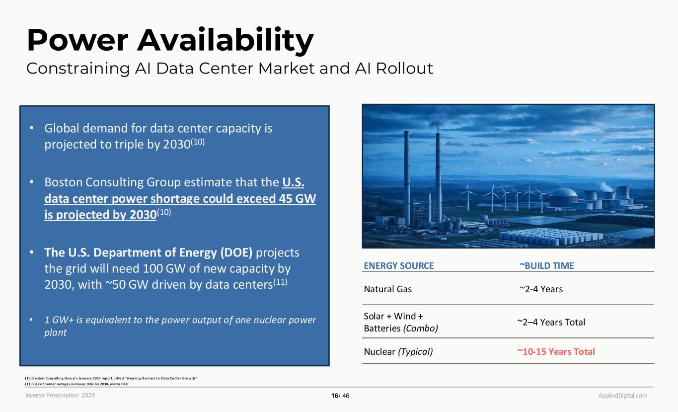AppliedDigital.comInvestor Presentation 2026 Power Availability Constraining AI Data Center Market and AI Rollout • Global demand for data center capacity is projected to triple by 2030(10) • Boston Consulting Group estimate that the U.S. data center power shortage could exceed 45 GW is projected by 2030(10) • The U.S. Department of Energy (DOE) projects the grid will need 100 GW of new capacity by 2030, with ~50 GW driven by data centers(11) • 1 GW+ is equivalent to the power output of one nuclear power plant ENERGY SOURCE ~BUILD TIME Natural Gas ~2-4 Years Solar + Wind + Batteries (Combo) ~2–4 Years Total Nuclear (Typical) ~10-15 Years Total (10) Boston Consulting Group’ s Ja nuary 2025 report, title d “Brea king Barriers to Data Ce nter Growth” (11) Risk of pow er outages increa se 100x by 2030, w arns D OE 16 / 46
