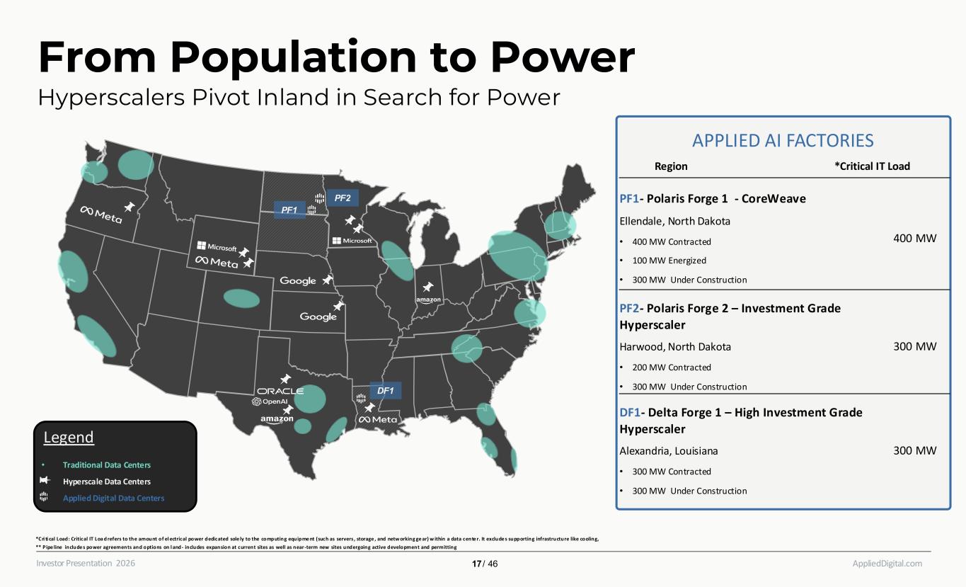 AppliedDigital.comInvestor Presentation 2026 *The described power pipeline, including sites under control/executed agreements and projected expansions/greenfield developments, constitutes forward-looking information; actual outcomes may differ due to risks in permitting, infrastructure needs (e.g., generation, transmission, substations), regulatory approvals, and market conditions Power & Site Pipeline I. TOTAL OF CURRENT SITES (1 GW *CRITICAL IT) P F 1 P F 2 D F 1 III. EXTENDED PIPELINE (>5 GW *UTILITY POWER) Power and land in early stages of discussion or due diligence. Under Construction (900 MW Critical IT) Polaris Forge 1: 300 MW Polaris Forge 2: 300 MW Delta Forge 1: 300 MW Polaris Forge 1 – Building 1: 100 MW Operating Capacity (100 MW Critical IT) In-Negotiation: 100 MW Contracted (900 MW Critical IT) II. ACTIVE PIPELINE SITES (~3.5 GW *UTILITY POWER) Includes:​ • Multiple near-term greenfield / new sites in active development in multiple states​ • Expansions at existing sites – many with scalable capacity up to 1 GW each Power pipeline includes sites with land under control and/or executed utility agreements for power delivery. This encompasses expansions at existing facilities as well as near-term greenfield/new sites actively progressing through development and permitting processes. Expansions at existing sites may necessitate new generation capacity, transmission lines, transformers, substations, or other infrastructure enhancements. 18 / 46