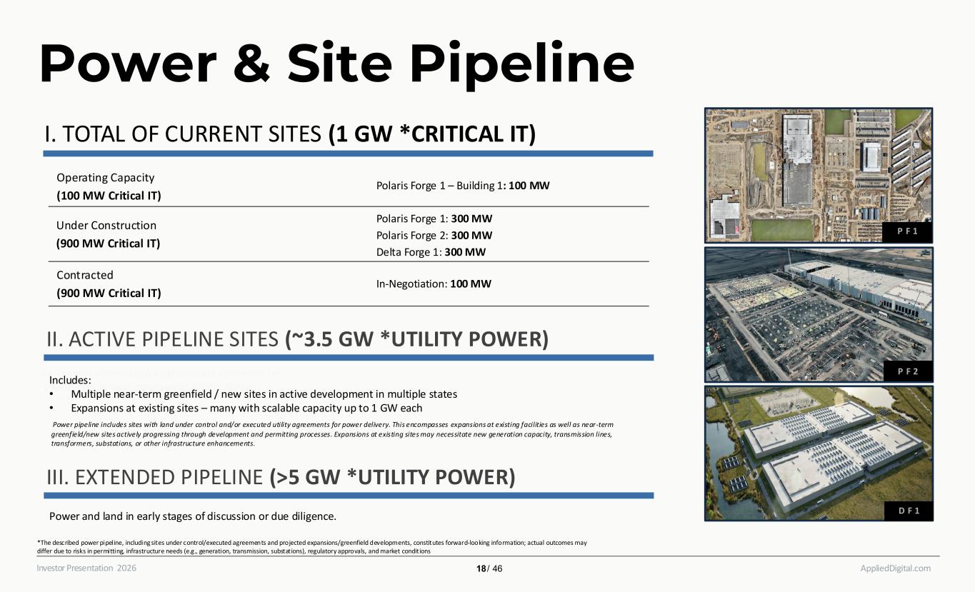 AppliedDigital.comInvestor Presentation 2026 From Population to Power Hyperscalers Pivot Inland in Search for Power • Traditional Data Centers • Hyperscale Data Centers • Applied Digital Data Centers Legend DF1 PF1 PF2 APPLIED AI FACTORIES PF1- Polaris Forge 1 - CoreWeave Ellendale, North Dakota • 400 MW Contracted • 100 MW Energized • 300 MW Under Construction 400 MW PF2- Polaris Forge 2 – Investment Grade Hyperscaler Harwood, North Dakota • 200 MW Contracted • 300 MW Under Construction 300 MW DF1- Delta Forge 1 – High Investment Grade Hyperscaler Alexandria, Louisiana • 300 MW Contracted • 300 MW Under Construction 300 MW Region *Critical IT Load *Cri ti cal Load: Critical IT Loa d refers to the amount of el ectrical power dedicated sole ly to the computing equipme nt (such as servers , storage , and netw orking ge ar) w ithin a data cente r. It exclude s supporting infrastructure like cooling, ** Pipe line include s power agreements and options on l and - includes expansion at current sites as well as near-term new sites undergoing active development and permitting 17 / 46