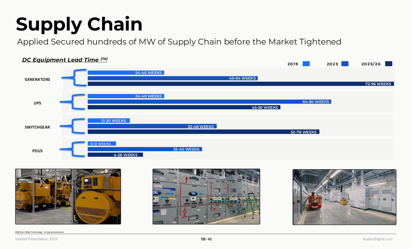 AppliedDigital.comInvestor Presentation 2026 Supply Chain Applied Secured hundreds of MW of Supply Chain before the Market Tightened (14) Worl Wide Te chnology - AI day presentation. 19 / 46 20 1 9 20 2 3 20 2 5/ 2 6 GENERATORS UPS SWITCHGEAR PDUS 24-40 WEEKS 40-64 WEEKS 72-96 WEEKS 24-40 WEEKS 64-80 WEEKS 45-50 WEEKS 52-78 WEEKS 32-48 WEEKS 12-20 WEEKS 8-12 WEEKS 4-28 WEEKS 32-40 WEEKS DC Equipment Lead Time (14)