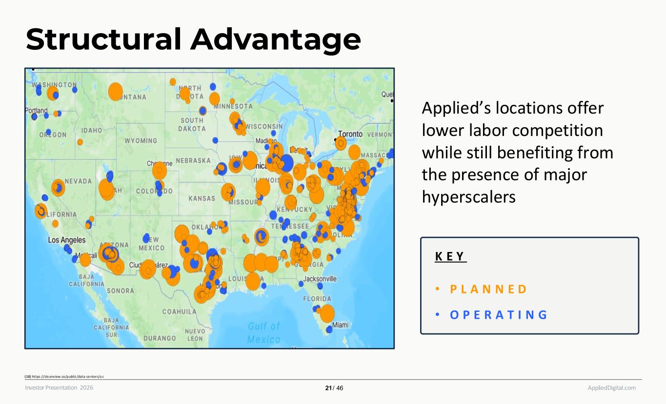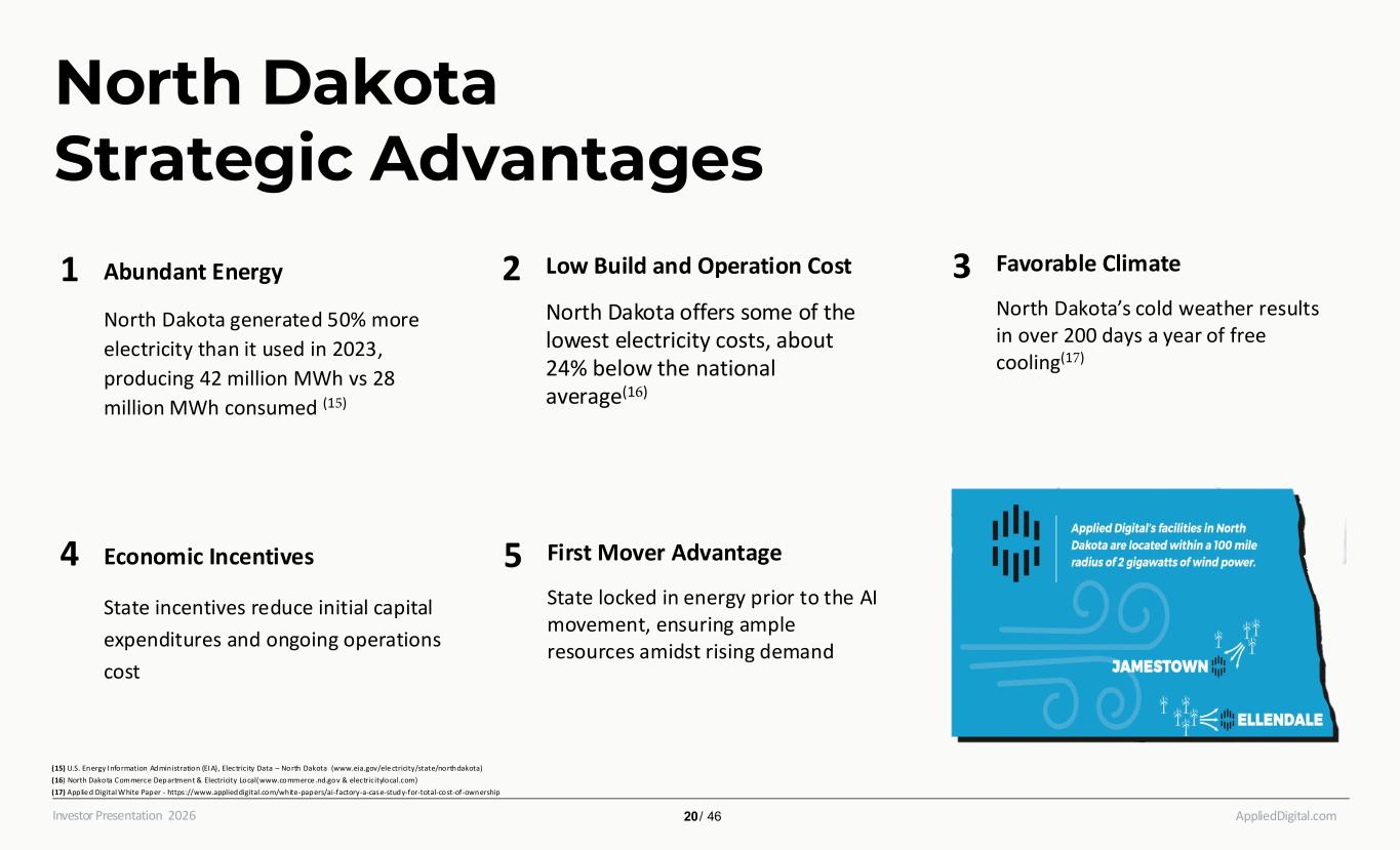 AppliedDigital.comInvestor Presentation 2026 North Dakota Strategic Advantages (15) U.S. Energy I nformation Administration (EI A), Electricity Data – North Dakota (www.eia.gov/ele ctricity/state/northdakota) (16) North Dakota Commerce Department & Electricity Local(www.commerce .nd.gov & electricitylocal.com) (17) Applie d Digital White Paper - https ://www.applieddigital.com/white-papers/ai-factory-a-case-study-for-total-cost-of-ownership 1 Low Build and Operation Cost North Dakota offers some of the lowest electricity costs, about 24% below the national average(16) 2 Favorable Climate North Dakota’s cold weather results in over 200 days a year of free cooling(17) 3Abundant Energy North Dakota generated 50% more electricity than it used in 2023, producing 42 million MWh vs 28 million MWh consumed (15) Economic Incentives State incentives reduce initial capital expenditures and ongoing operations cost 4 First Mover Advantage State locked in energy prior to the AI movement, ensuring ample resources amidst rising demand 5 20 / 46