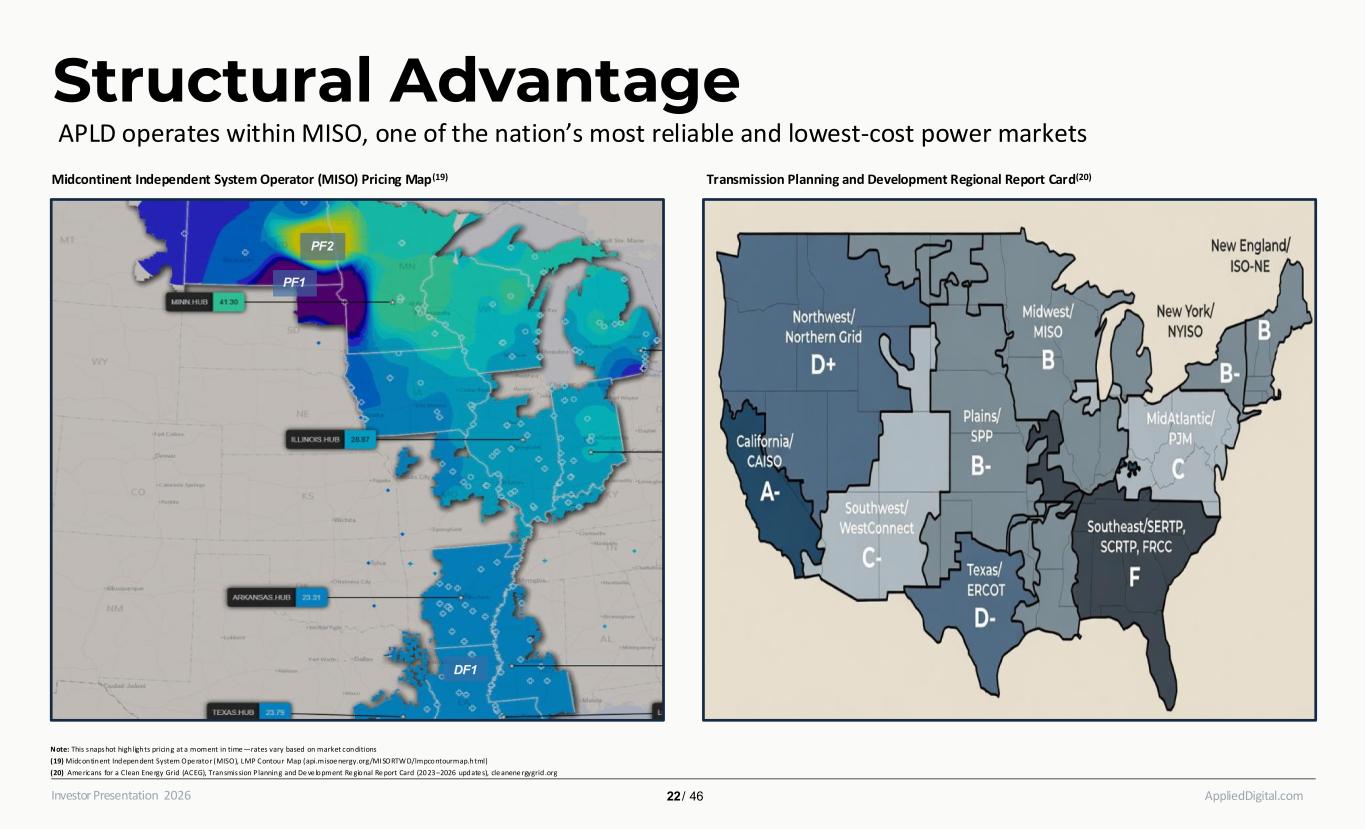 AppliedDigital.comInvestor Presentation 2026 Structural Advantage PF1 PF2 Midcontinent Independent System Operator (MISO) Pricing Map(19) APLD operates within MISO, one of the nation’s most reliable and lowest-cost power markets Note: This snapshot highlights pricing at a moment in time —rates vary based on market conditions (19) Midcontinent Independent System Ope rator (MISO), LMP Contour Map (api.misoe nergy.org/MI SORTWD/lmpcontourmap.html) (20) Ame ricans for a Clean Ene rgy Grid (ACEG), Transmission P lanning and De ve lopment Re gional Re port Card (20 23–2026 update s), cle anene rgygrid.org 22 / 46 DF1 Transmission Planning and Development Regional Report Card(20)