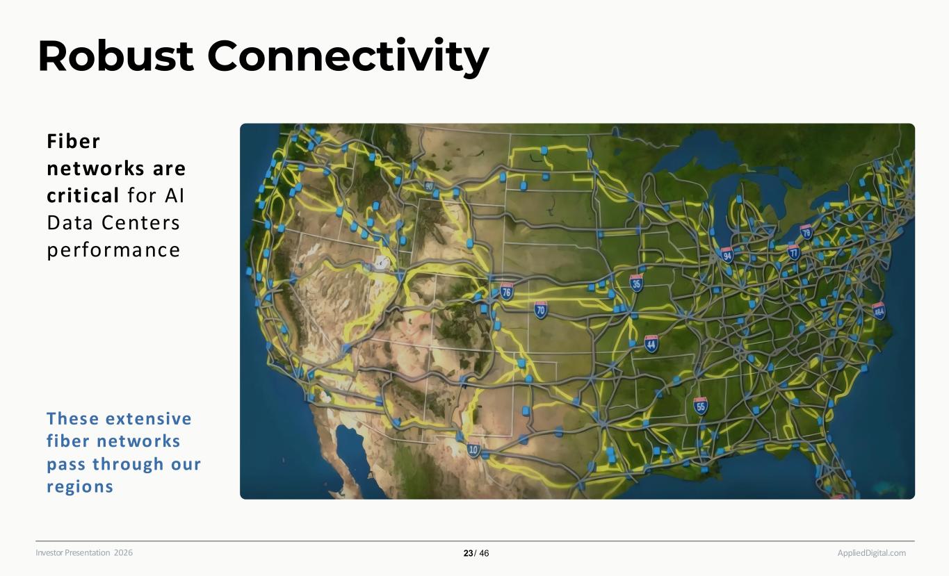 AppliedDigital.comInvestor Presentation 2026 Robust Connectivity These extensive fiber networks pass through our regions Fiber networks are critical for AI Data Centers performance 23 / 46
