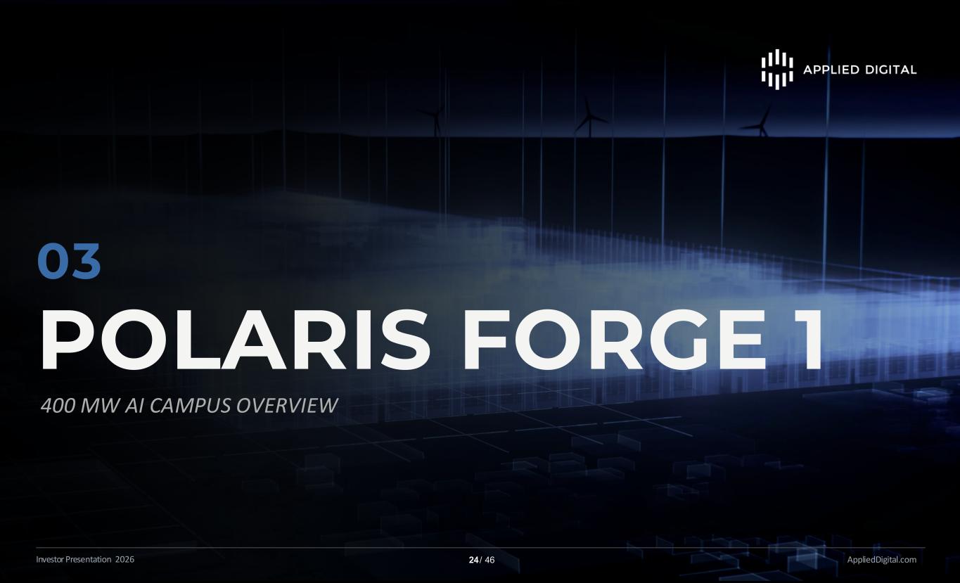 POLARIS FORGE 1 POLARIS FORGE 1 AppliedDigital.comInvestor Presentation 2026 24 / 46 03 400 MW AI CAMPUS OVERVIEW