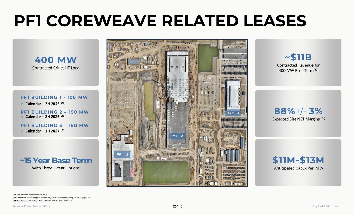 AppliedDigital.comInvestor Presentation 2026 PF1 COREWEAVE RELATED LEASES (21) Presented on a calendar-year basis ​ (22) Contracted revenue figures exclude any amounts attributable to pass-through power​ (23) See Appendix on manage ment sche dule on Non-GAAP Measures ​ 400 MW Contracted Critical IT Load ~15 Year Base Term With Three 5-Year Options ~$11B Contracted Revenue for 400 MW Base Term(22) 88%+/- 3% Expected Site NOI Margins (23) $11M-$13M Anticipated CapEx Per MW PF1 BUI LDING 1 - 100 MW ✓ Calendar – 2H 2025 (21) PF1 BUI LDING 2 – 150 MW PF1 BUILDING 3 – 150 MW o Calendar – 2H 2026 (21) o Calendar – 1H 2027 (21) PF1 – 1 PF1 – 2 PF1 – 3 25 / 46