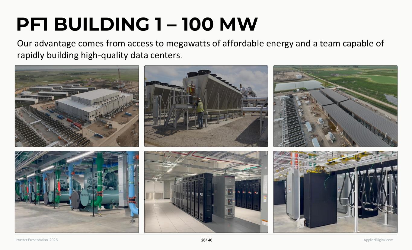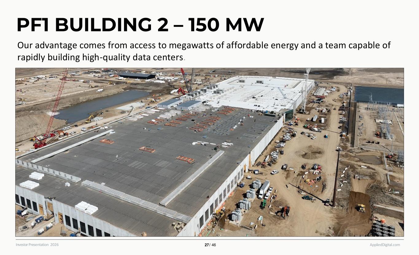 AppliedDigital.comInvestor Presentation 2026 PF1 BUILDING 1 – 100 MW 26 / 46 Our advantage comes from access to megawatts of affordable energy and a team capable of rapidly building high-quality data centers.