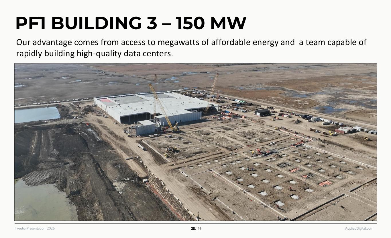 AppliedDigital.comInvestor Presentation 2026 PF1 BUILDING 2 – 150 MW Our advantage comes from access to megawatts of affordable energy and a team capable of rapidly building high-quality data centers. 27 / 46