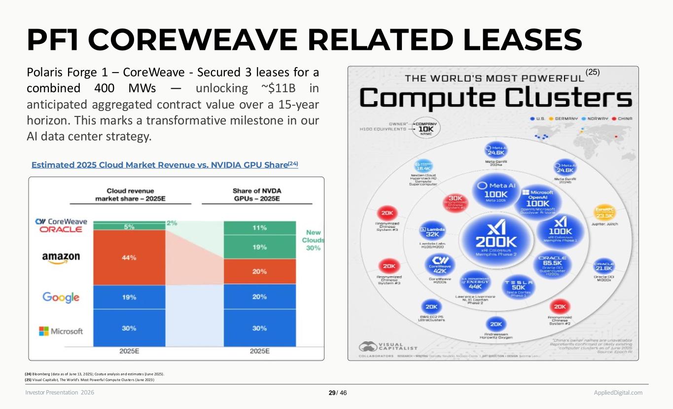 AppliedDigital.comInvestor Presentation 2026 Polaris Forge 1 – CoreWeave - Secured 3 leases for a combined 400 MWs — unlocking ~$11B in anticipated aggregated contract value over a 15-year horizon. This marks a transformative milestone in our AI data center strategy. Estimated 2025 Cloud Market Revenue vs. NVIDIA GPU Share(24) (24) Bloomberg (data as of June 13, 2 025); Coatue analysis and estimate s (June 2025). (25) Visual Capitalis t, The World’s Most Powerful Compute Cluste rs (June 2023 ) PF1 COREWEAVE RELATED LEASES 29 / 46 (25)