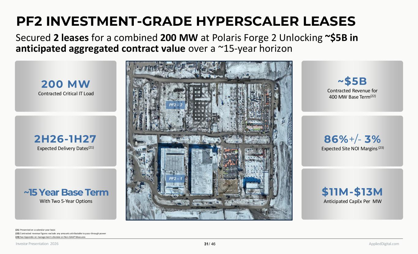 AppliedDigital.comInvestor Presentation 2026 PF2 INVESTMENT-GRADE HYPERSCALER LEASES 200 MW Contracted Critical IT Load ~15 Year Base Term With Two 5-Year Options ~$5B Contracted Revenue for 400 MW Base Term(22) 86%+/- 3% Expected Site NOI Margins (23) $11M-$13M Anticipated CapEx Per MW PF2 – 2 PF2 – 1 Secured 2 leases for a combined 200 MW at Polaris Forge 2 Unlocking ~$5B in anticipated aggregated contract value over a ~15-year horizon 2H26-1H27 Expected Delivery Dates(21) (21) Presented on a calendar-year basis ​ (22) Contracted revenue figures exclude any amounts attributable to pass-through power​ (23) See Appendix on manage ment sche dule on Non-GAAP Measures ​ 31 / 46