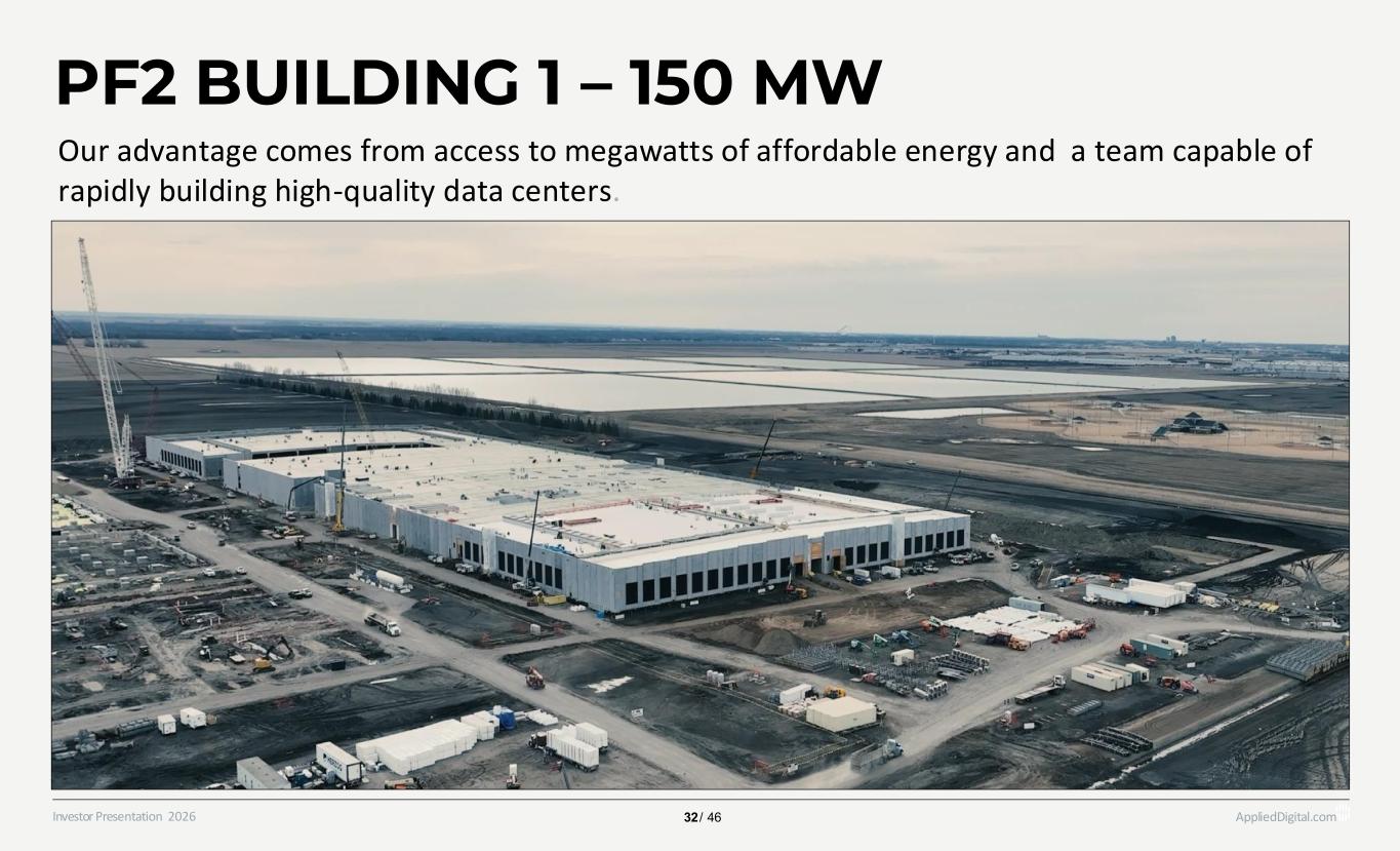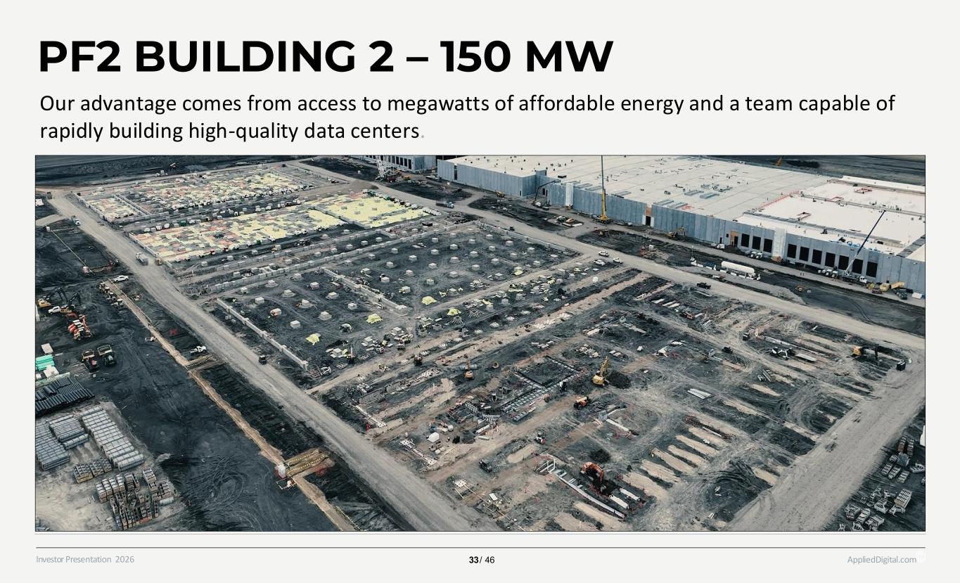 AppliedDigital.comInvestor Presentation 2026 PF2 BUILDING 1 – 150 MW 32 / 46 Our advantage comes from access to megawatts of affordable energy and a team capable of rapidly building high-quality data centers.