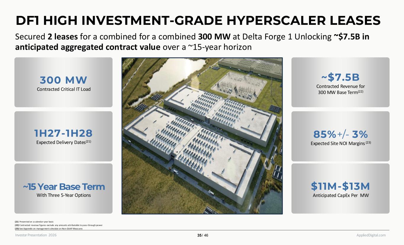AppliedDigital.comInvestor Presentation 2026 300 MW Contracted Critical IT Load ~15 Year Base Term With Three 5-Year Options ~$7.5B Contracted Revenue for 300 MW Base Term(22) 85%+/- 3% Expected Site NOI Margins (23) $11M-$13M Anticipated CapEx Per MW 1H27-1H28 Expected Delivery Dates(21) (21) Presented on a calendar-year basis ​ (22) Contracted revenue figures exclude any amounts attributable to pass-through power​ (23) See Appendix on manage ment sche dule on Non-GAAP Measures ​ 35 / 46 DF1 HIGH INVESTMENT-GRADE HYPERSCALER LEASES Secured 2 leases for a combined for a combined 300 MW at Delta Forge 1 Unlocking ~$7.5B in anticipated aggregated contract value over a ~15-year horizon