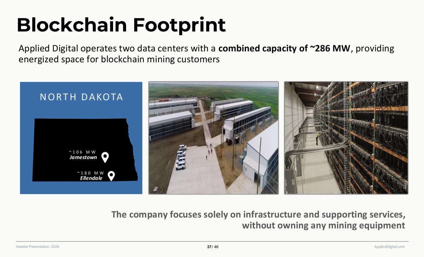 AppliedDigital.comInvestor Presentation 2026 Blockchain Footprint The company focuses solely on infrastructure and supporting services, without owning any mining equipment Jamestown Ellendale N ORT H D AKOTA EL N0 1 ~ 1 0 6 M W ~ 1 8 0 M W Applied Digital operates two data centers with a combined capacity of ~286 MW, providing energized space for blockchain mining customers 37 / 46
