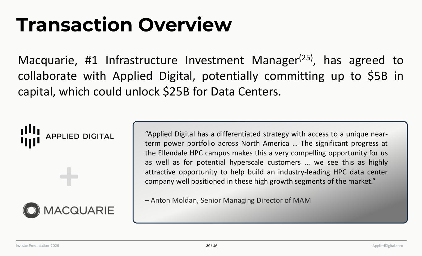 AppliedDigital.comInvestor Presentation 2026 Transaction Overview + Macquarie, #1 Infrastructure Investment Manager(25), has agreed to collaborate with Applied Digital, potentially committing up to $5B in capital, which could unlock $25B for Data Centers. “Applied Digital has a differentiated strategy with access to a unique near- term power portfolio across North America … The significant progress at the Ellendale HPC campus makes this a very compelling opportunity for us as well as for potential hyperscale customers … we see this as highly attractive opportunity to help build an industry-leading HPC data center company well positioned in these high growth segments of the market.” – Anton Moldan, Senior Managing Director of MAM 39 / 46