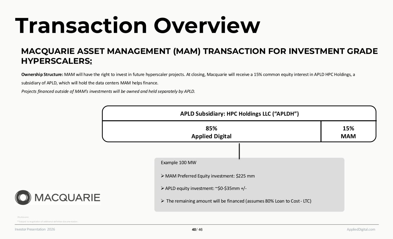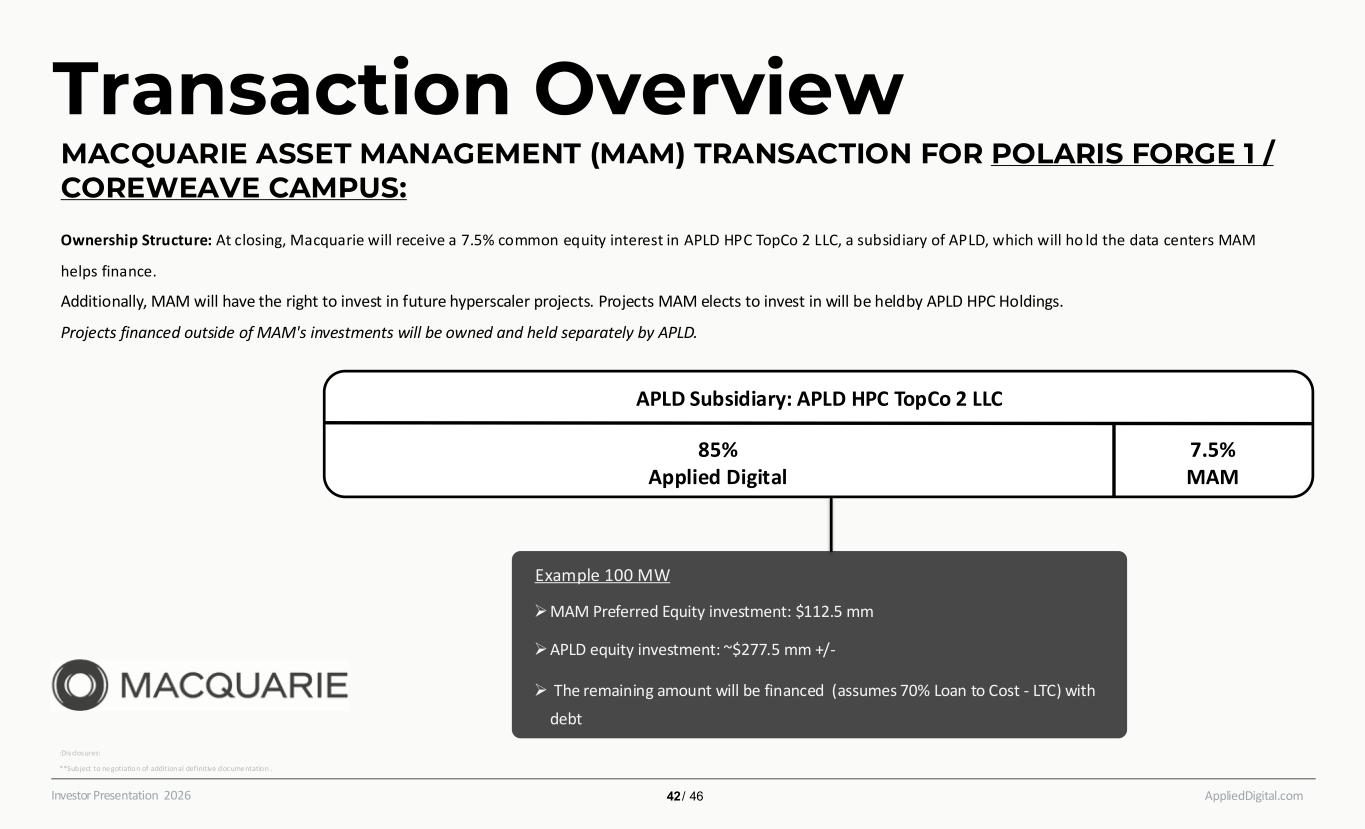 AppliedDigital.comInvestor Presentation 2026 Transaction Overview MACQUARIE ASSET MANAGEMENT (MAM) TRANSACTION FOR POLARIS FORGE 1 / COREWEAVE CAMPUS: APLD Subsidiary: APLD HPC TopCo 2 LLC 85% Applied Digital 7.5% MAM Example 100 MW ➢MAM Preferred Equity investment: $112.5 mm ➢APLD equity investment: ~$277.5 mm +/- ➢ The remaining amount will be financed (assumes 70% Loan to Cost - LTC) with debt Ownership Structure: At closing, Macquarie will receive a 7.5% common equity interest in APLD HPC TopCo 2 LLC, a subsidiary of APLD, which will ho ld the data centers MAM helps finance. Additionally, MAM will have the right to invest in future hyperscaler projects. Projects MAM elects to invest in will be held by APLD HPC Holdings. Projects financed outside of MAM's investments will be owned and held separately by APLD. :Disclosures: **Subject to ne gotiation of additional definitive docume ntation .​ 42 / 46