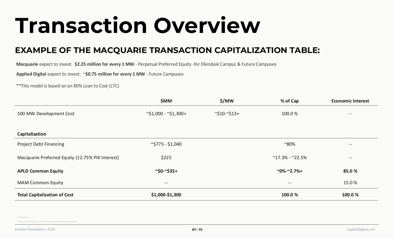 AppliedDigital.comInvestor Presentation 2026 Transaction Overview EXAMPLE OF THE MACQUARIE TRANSACTION CAPITALIZATION TABLE: Macquarie expect to invest: $2.25 million for every 1 MW - Perpetual Preferred Equity -for Ellendale Campus & Future Campuses Applied Digital expect to invest: ~$0.75 million for every 1 MW - Future Campuses **This model is based on an 80% Loan to Cost (LTC) $MM $/MW % of Cap Economic Interest 100 MW Development Cost ~$1,000 - ~$1,300+ ~$10-~$13+ 100.0 % -- Capitalization Project Debt Financing ~$775 - $1,040 ~80% -- Macquarie Preferred Equity (12.75% PIK Interest) $225 ~17.3% - ~22.5% -- APLD Common Equity ~$0-~$35+ ~0%-~2.7%+ 85.0 % MAM Common Equity -- -- 15.0 % Total Capitalization of Cost $1,000-$1,300 100.0 % 100.0 % :Disclosures: **Subject to ne gotiation of additional definitive docume ntation .​ 41 / 46
