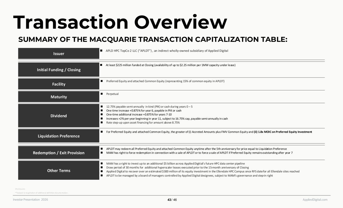 AppliedDigital.comInvestor Presentation 2026 Transaction Overview SUMMARY OF THE MACQUARIE TRANSACTION CAPITALIZATION TABLE: Issuer ◼ APLD HPC TopCo 2 LLC (“APLDT”) , an indirect wholly-owned subsidiary of Applied Digital Initial Funding / Closing ◼ At least $225 million funded at Closing (availability of up to $2.25 million per 1MW capacity under lease) Facility ◼ Preferred Equity and attached Common Equity (representing 15% of common equity in APLDT) Maturity ◼ Perpetual Dividend ◼ 12.75% payable semi-annually in kind (PIK) or cash during years 0 – 5 ◼ One time increase +0.875% for year 6, payable in PIK or cash ◼ One-time additional increase +0.875% for years 7-10 ◼ Increases +2% per year beginning in year 11, subject to 16.75% cap, payable semi-annually in cash ◼ Rate step-up upon asset financing for amount above 8.75% Liquidation Preference ◼ For Preferred Equity and attached Common Equity, the greater of (i) Accreted Amounts plus FMV Common Equity and (ii) 1.8x MOIC on Preferred Equity Investment Redemption / Exit Provision ◼ APLDT may redeem all Preferred Equity and attached Common Equity anytime after the 5th anniversary for price equal to Liquidation Preference ◼ MAM has right to force redemption in connection with a sale of APLDT or to force a sale of APLDT if Preferred Equity remains outstanding after year 7 Other Terms ◼ MAM has a right to invest up to an additional $5 billion across Applied Digitial's future HPC data center pipeline ◼ Draw period of 30 months for additional hyperscaler leases executed prior to the 15-month anniversary of Closing ◼ Applied Digital to recover over an estimated $300 million of its equity investment in the Ellendale HPC Campus once RFS date for all Ellendale sites reached ◼ APLDT to be managed by a board of managers controlled by Applied Digital designees, subject to MAM's governance and step-in right :Disclosures: **Subject to ne gotiation of additional definitive docume ntation .​ 43 / 46