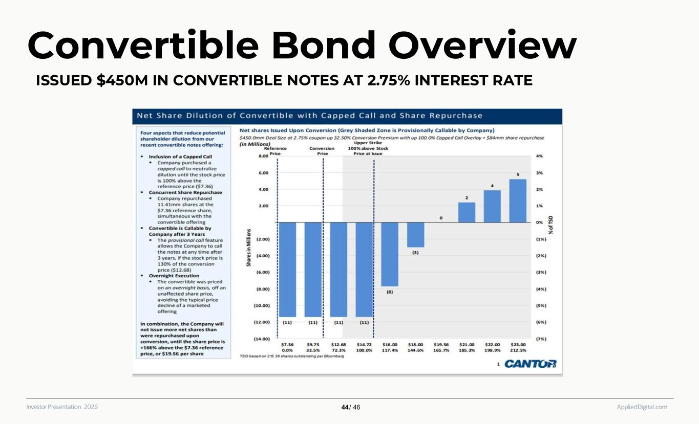 AppliedDigital.comInvestor Presentation 2026 Convertible Bond Overview ISSUED $450M IN CONVERTIBLE NOTES AT 2.75% INTEREST RATE 44 / 46