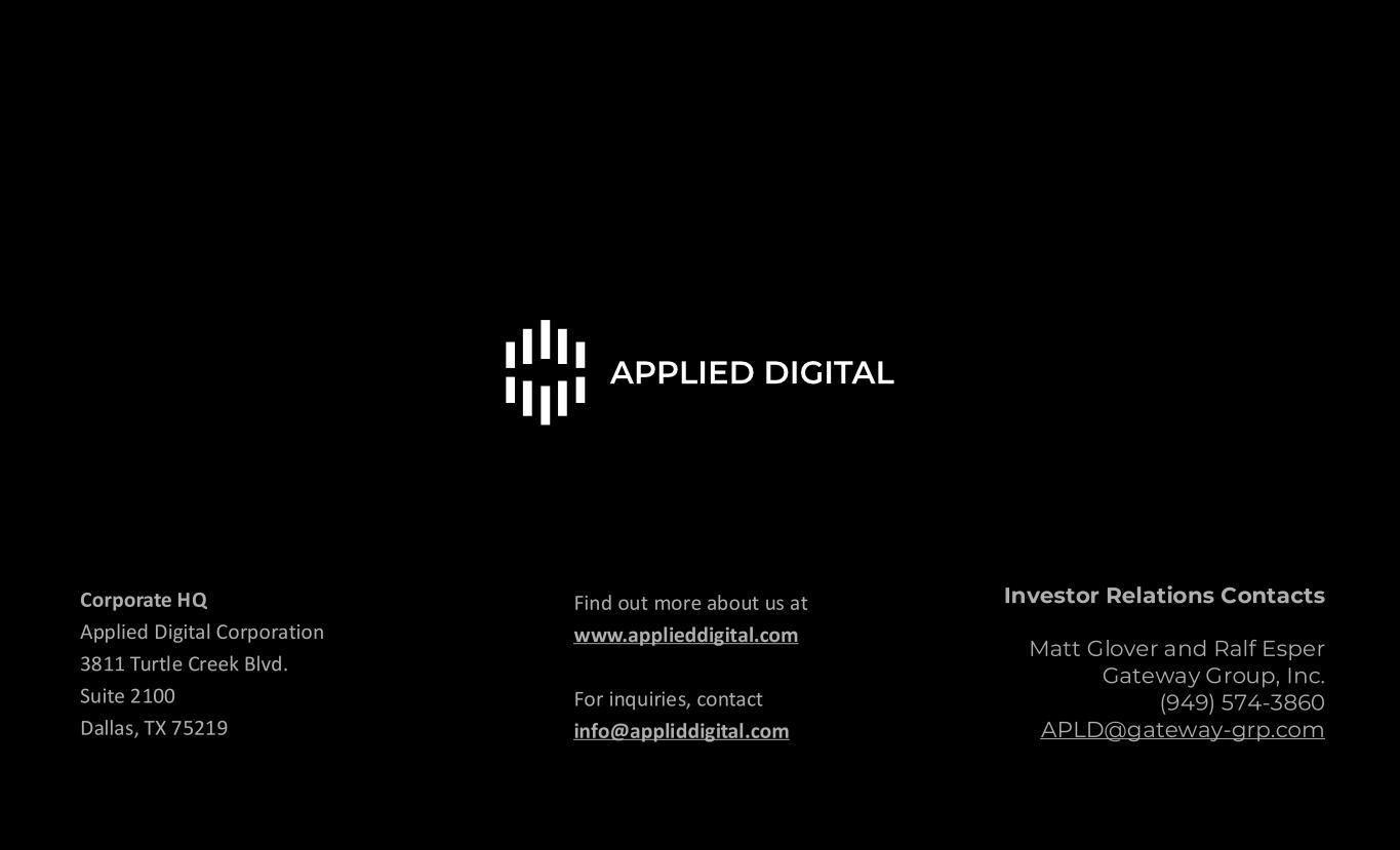 Find out more about us at www.applieddigital.com For inquiries, contact info@appliddigital.com Corporate HQ Applied Digital Corporation 3811 Turtle Creek Blvd. Suite 2100 Dallas, TX 75219 Investor Relations Contacts Matt Glover and Ralf Esper Gateway Group, Inc. (949) 574-3860 APLD@gateway-grp.com