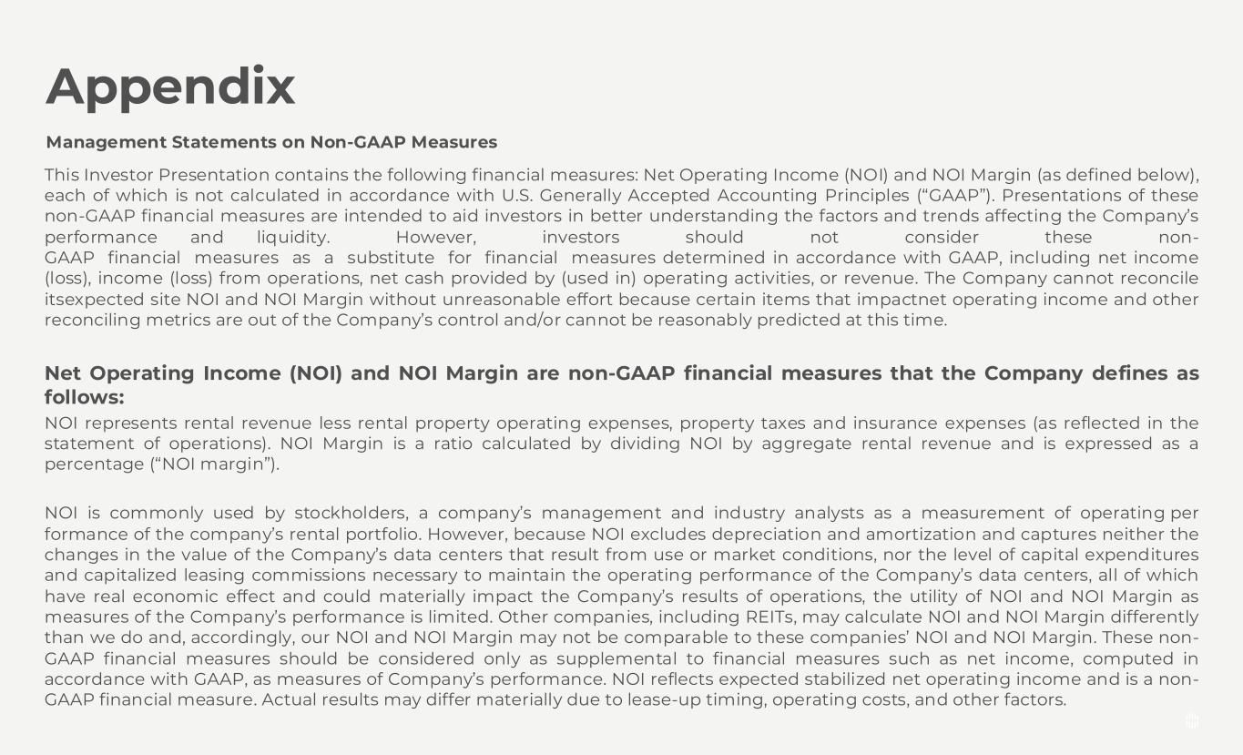 Non-GAAP Financial Measures This Investor Presentation contains the following financial measures: Net Operating Income (NOI) and NOI Margin (as defined below), each of which is not calculated in accordance with U.S. Generally Accepted Accounting Principles (“GAAP”). Presentations of these non-GAAP financial measures are intended to aid investors in better understanding the factors and trends affecting the Company’s performance and liquidity. However, investors should not consider these non- GAAP financial measures as a substitute for financial measures determined in accordance with GAAP, including net income (loss), income (loss) from operations, net cash provided by (used in) operating activities, or revenue. The Company cannot reconcile itsexpected site NOI and NOI Margin without unreasonable effort because certain items that impactnet operating income and other reconciling metrics are out of the Company’s control and/or cannot be reasonably predicted at this time. Net Operating Income (NOI) and NOI Margin are non-GAAP financial measures that the Company defines as follows: NOI represents rental revenue less rental property operating expenses, property taxes and insurance expenses (as reflected in the statement of operations). NOI Margin is a ratio calculated by dividing NOI by aggregate rental revenue and is expressed as a percentage (“NOI margin”). NOI is commonly used by stockholders, a company’s management and industry analysts as a measurement of operating per formance of the company’s rental portfolio. However, because NOI excludes depreciation and amortization and captures neither the changes in the value of the Company’s data centers that result from use or market conditions, nor the level of capital expenditures and capitalized leasing commissions necessary to maintain the operating performance of the Company’s data centers, all of which have real economic effect and could materially impact the Company’s results of operations, the utility of NOI and NOI Margin as measures of the Company’s performance is limited. Other companies, including REITs, may calculate NOI and NOI Margin differently than we do and, accordingly, our NOI and NOI Margin may not be comparable to these companies’ NOI and NOI Margin. These non- GAAP financial measures should be considered only as supplemental to financial measures such as net income, computed in accordance with GAAP, as measures of Company’s performance. NOI reflects expected stabilized net operating income and is a non- GAAP financial measure. Actual results may differ materially due to lease-up timing, operating costs, and other factors. Appendix Management Statements on Non-GAAP Measures