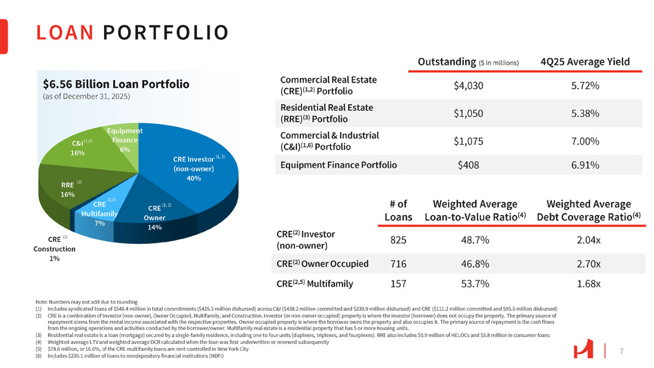 LOAN PRODUCTION 6 Loan production of $374.8 million in the fourth quarter, which included Commercial Real Estate production of $125.9 million . (1) $49.7 million, $55.2 million, $46.8 million, $44.9 million, and $44.1 of SBA loan production includes $15.4 million, $30.8 million, $23.3 million, $20.6 million, and $22.3 million of loans secured by CRE and the remainder representing C&I loans for 4Q24, 1Q25, 2Q25, 3Q25, and 4Q25, respectively (2) Production includes purchases of guaranteed SBA loans of $20.3 million, and $11.0 million for 4Q24 and 1Q25, respectively (3) Production includes mortgage loan purchases of $10.0 million, $10.3 million, $3.0 million, and $3.4 million for 1Q25, 2Q25, 3Q25, and 4Q25, respectively (4) Production includes C&I loan purchases of $0.6 million for 4Q24 (5) Weighted average interest rated is the stated weighted average coupon $125.9M Commercial real estate loan production $82.1M Commercial and industrial loan production $52.5M Equipment finance production $70.3M Residential mortgage (3) production $44.1M SBA (1,2) loan production 43% 42% 31% 34% 37% 6% $339.0 15% 12% 12% 18% $345.9 16% 16% 14% 12% $329.6 14% 26% 10% 16% 34% $570.8 8% 18% $374.8 12% 19% 14% 21% 7.37% 7.35% 7.10% 6.91% 6.90% 1Q25 C&I (4) 4Q25 SBA (1,2) 4Q24 CRE 2Q25 Equipment Finance 3Q25 RRE (3) New Production and Weighted Average Interest Rate (5) ($ in millions)