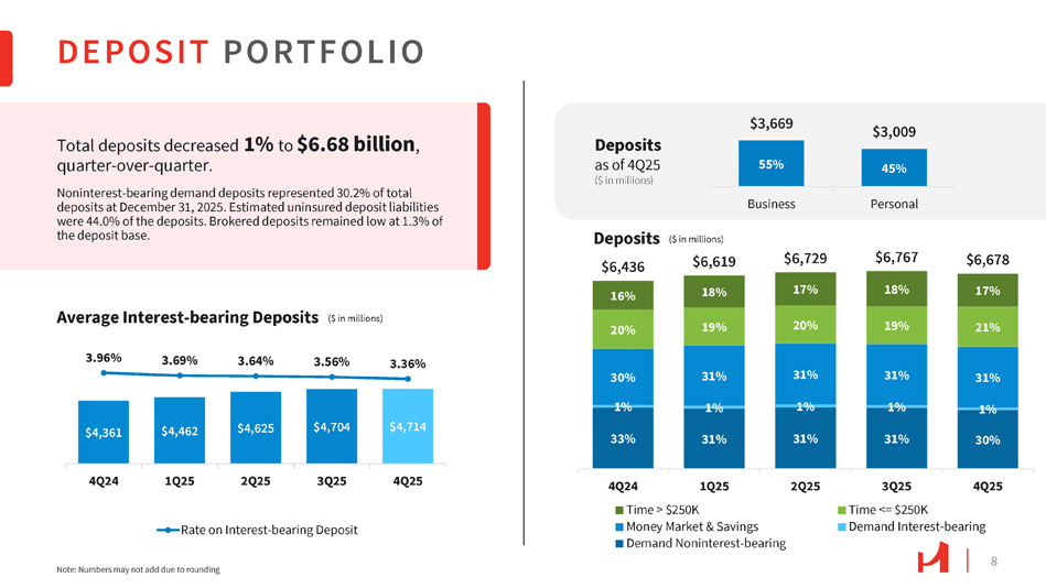 $4,361 $4,462 $4,625 $4,704 $4,714 3.96% 3.69% 3.64% 3.56% 3.36% 4Q24 1Q25 2Q25 3Q25 4Q25 Rate on Interest - bearing Deposit Average Interest - bearing Deposits DEPOSIT PORTFOLIO Total deposits decreased 1% to $6.68 billion , quarter - over - quarter. Noninterest - bearing demand deposits represented 30.2% of total deposits at December 31, 2025. Estimated uninsured deposit liabilities were 44.0% of the deposits. Brokered deposits remained low at 1.3% of the deposit base. Note: Numbers may not add due to rounding 20% Deposits $6,436 16% $6,678 $6,767 $6,729 $6,619 17% 18% 17% 18% 21% 19% 20% 19% 31% 31% 31% 31% 30% 1% 1% 1% 1% 1% 30% 31% 31% 31% 33% 4Q25 3Q25 Time <= $250K 2Q25 1Q25 4Q24 Time > $250K Demand Interest - bearing Money Market & Savings Demand Noninterest - bearing ($ in millions) Deposits as of 4Q25 ($ in millions) 55% 45% $3,669 $3,009 Business Personal 8 ($ in millions)