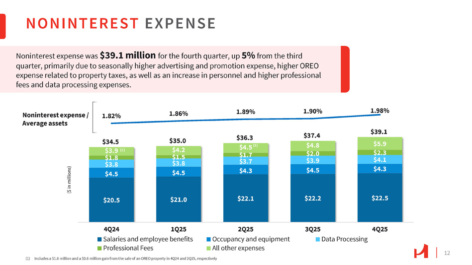 11 $2.2 37% $1.7 29% $0.3 5% $0.9 15% $0.8 14% Service charges on deposit accounts Trade finance and other service charges and fees Servicing income Bank - owned life insurance All other operating income NONINTEREST INCOME $49.7 $55.2 $46.8 $44.9 $44.1 $21.6 $32.2 $35.4 $32.6 $29.9 8.53% 7.82% 7.61% 6.95% 7.40% 4Q24 1Q25 SBA Production 2Q25 SBA Loan Sales 3Q25 4Q25 SBA Trade Premium $5.7 $5.5 $6.8 $5.9 $1.4 $2.0 $2.2 $1.9 $1.8 $0.3 $0.2 $1.2 $0.6 $7.4 $7.7 $8.1 $9.9 $8.3 4Q24 1Q25 Service charges, fees & other 2Q25 Gain on sale of SBA loans (1) $5.9 Numbers may not add due to rounding (1) Includes $0.4 million and $0.9 million in BOLI benefit for 2Q25 and 3Q25, respectively (2) There was a mortgage loan sale transaction in each quarter, except 2Q25 had none and 3Q25 had two Noninterest income for the fourth quarter was $8.3 million , down 16% from the third quarter, primarily due to the absence of a $0.9 million death benefit claim from bank - owned life insurance and a $0.6 million decline in gain on the sale of residential mortgage loans (2) . Noninterest Income 㸦 $ in millions 㸧 4Q25 Service Charges, Fees & Other 㸦 $ in millions 㸧 SBA 7(a) Loan Production and Sales 㸦 $ in million 㸧 (1) 3Q25 4Q25 Gain of sale of mortgage loans (1)