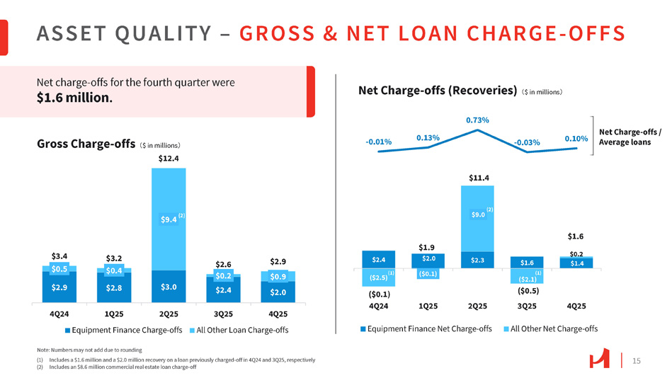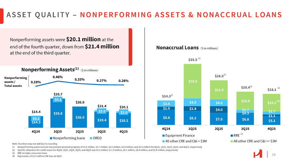 13 $7.7 $9.1 $5.2 $10.7 $8.2 $12.4 $18.4 $17.3 $10.9 $3.5 $7.4 $11.6 $7.0 $4.6 $17.6 0.30% 0.28% 0.17% 0.18% 0.27% 3Q25 4Q25 All Other Delinquent Loans 4Q24 1Q25 2Q25 Equipment Finance Delinquent Loans Numbers may not add due to rounding ASSET QUALITY – DELINQUENT & CRITICIZED LOANS Delinquent loans / Total loans $118.4 $165.3 $164.9 $97.0 2.64% 2.62% 0.74% 0.69% 1.48% Criticized loans / Total loans $139.6 (3) (1) Represents loans 30 to 89 days past due and still accruing (2) Includes nonaccrual loans of $13.4 million, $34.4 million, $24.1 million, $19.4 million, and $18.1 million as of 4Q24, 1Q25, 2Q25, 3Q25, and 4Q25, respectively (3) Includes two special mention CRE loans of $106.5 million in the hospitality industry, a $19.5 million C&I loan in the healthcare industry, and a $12.4 million C&I relationship in the retail industry (4) Includes two special mention CRE loans of $105.8 million in the hospitality industry and a $12.2 million C&I relationship in the retail industry (5) Includes a CRE loan designated nonaccrual totaling $20.0 million, $11.0 million , $10.6 million, and $10.2 million for 1Q25, 2Q25, 3Q25, and 4Q25, respectively (6) Includes a C&I relationship in the retail industry totaling $12.2 million, $11.8 million, and $11.6 million for 2Q25, 3Q25, and 4Q25, respectively (7) Includes one special mention CRE loan of $55.0 million in the hospitality industry (4) (6,7) $71.1 $25.9 (5) $45.4 $16.8 (6) (5) $28.6 $46.6 $12.7 (6) $33.9 (5) (5) $46.5 $25.7 4Q25 3Q25 Special Mention 2Q25 1Q25 Classified 4Q24 The $51.6 million increase in criticized loans in the fourth quarter was primarily driven by a $55.0 million commercial real estate hospitality loan downgraded to special mention. Delinquent Loans (1) 㸦 $ in millions 㸧 Criticized Loans (2) 㸦 $ in millions 㸧