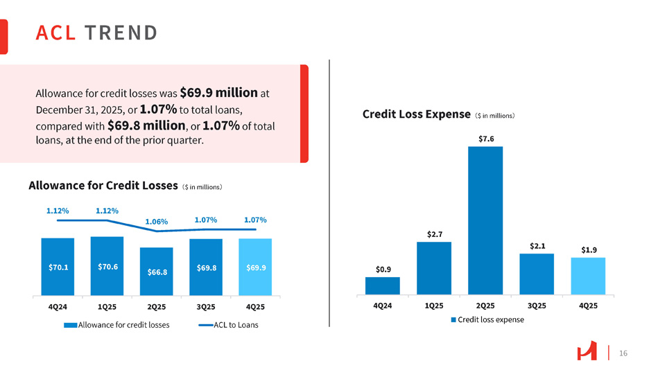 3 FORWARD - LOOKING STATEMENTS Hanmi Financial Corporation (the “Company”) cautions investors that any statements contained herein that are not historical facts are forward - looking statements within the meaning of the “safe harbor” provisions of the Private Securities Litigation Reform Act of 1995 , including, but not limited to, those statements regarding operating performance, financial position and liquidity, business strategies, regulatory, economic and competitive outlook, investment and expenditure plans, capital and financing needs and availability, litigation, plans and objectives, merger or sale activity, and all other forecasts and statements of expectation or assumption underlying any of the foregoing . These statements involve known and unknown risks and uncertainties that are difficult to predict . Investors should not rely on any forward - looking statement and should consider risks, such as changes in governmental policy, legislation and regulations, changes in monetary policy, economic uncertainty and changes in economic conditions, potential recessionary conditions, inflation, the effect of the imposition of tariffs and any retaliatory responses, the impact of a potential federal government shutdown, including our ability to effect sales of small business administration loans, fluctuations in interest rate and credit risk, competitive pressures, our ability to access cost - effective funding, the ability to enter into new markets successfully and capitalize on growth opportunities, balance sheet management, liquidity and sources of funding, the size and composition of our deposit portfolio, including the percentage of uninsured deposits in the portfolio, increased assessments by the Federal Deposit Insurance Corporation, risk and effect of natural disasters, a failure in or breach of our operational or security systems or infrastructure, including cyberattacks, the adequacy of and changes in the economic estimates and methodology of calculating our allowance for credit losses, and other operational factors . Forward - looking statements are based upon the good faith beliefs and expectations of management as of this date only and are further subject to additional risks and uncertainties, including, but not limited to, the risk factors set forth in our earnings release dated January 27 , 2026 , including the section titled “Forward Looking Statements” and the Company’s most recent Form 10 - K, 10 - Q and other filings with the Securities and Exchange Commission . The Company disclaims any obligation to update or revise the forward - looking statements herein .