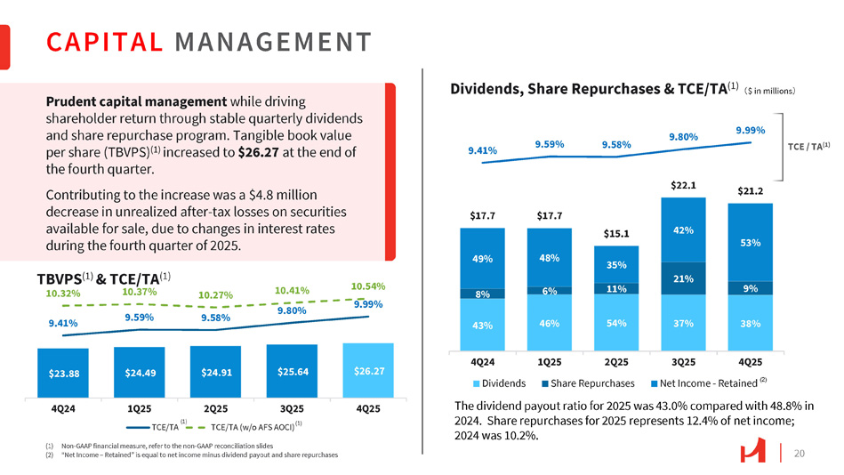 19 LIQUIDITY 4Q24 1Q25 (1) Rate at December 31, 2025, based on 3 - month SOFR + 166 bps (2) Issued in August 2021 and due in September 2031. The interest rate is fixed at 3.75% for 5 years. The rate resets quarterly commencing September 1, 2026 to the 3 - month SOFR + 310 bps. 15.1% 15.3% 16.3% 17.9% 17.7% 18.9% 15.6% 15.8% 16.9% 17.2% 18.3% 15.2% 13.5% 15.2% 13.5% 0.9% 1.1% 1.3% 1.3% 1.3% 2Q25 3Q25 4Q25 Liquid Assets to Total Assets Liquid Assets to Total Liabilities Liquid Assets to Deposits Brokered Deposits to Deposits Liquidity Position 㸦 $ in millions 㸧 Cash & Securities at Company - only 㸦 $ in millions 㸧 Company - only Subordinated Debentures 㸦 $ in millions 㸧 Liquidity Ratios % of Assets Balance 2.7% 213 $ Cash & cash equivalents 10.7% 834 Securities (unpledged) 0.1% 7 Loans available for Sale 13.5% 1,055 Liquid Assets 18.7% 1,463 FHLB available borrowing capacity 5.4% 425 FRB discount window borrowing capacity 1.8% 140 Federal funds lines (unsecured) available 25.9% 2,028 Secondary Liquidity Sources 39.4% 3,083 $ Bank Liquidity (Liquid Assets + Secondary Liquidity) Balance 9 $ Cash 46 Securities (AFS) 55 $ Amortized Rate Cost Par 5.38% 22 $ 27 $ 2036 Trust Preferred Securities 3.75% 109 110 2031 Subordinated Debt 131 $ 137 $ The Bank and the Company had ample liquidity resources at December 31, 2025. (1) (2)