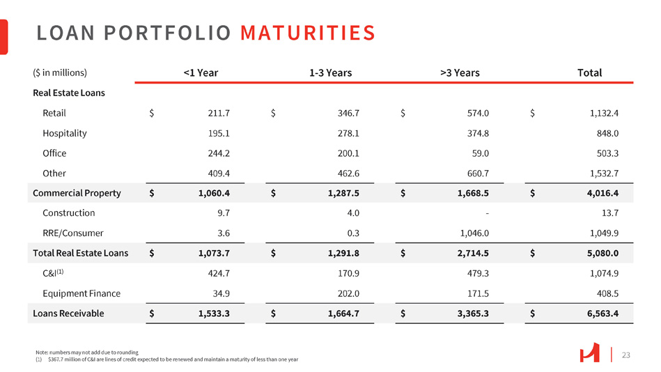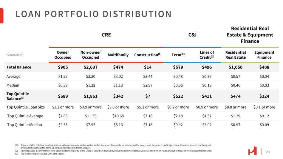 23 Total >3 Years 1 - 3 Years <1 Year ($ in millions) Real Estate Loans 1,132.4 $ 574.0 $ 346.7 $ 211.7 $ Retail 848.0 374.8 278.1 195.1 Hospitality 503.3 59.0 200.1 244.2 Office 1,532.7 660.7 462.6 409.4 Other 4,016.4 $ 1,668.5 $ 1,287.5 $ 1,060.4 $ Commercial Property 13.7 - 4.0 9.7 Construction 1,049.9 1,046.0 0.3 3.6 RRE/Consumer 5,080.0 $ 2,714.5 $ 1,291.8 $ 1,073.7 $ Total Real Estate Loans 1,074.9 479.3 170.9 424.7 C&I (1) 408.5 171.5 202.0 34.9 Equipment Finance 6,563.4 $ 3,365.3 $ 1,664.7 $ 1,533.3 $ Loans Receivable LOAN PORTFOLIO MATURITIES Note: numbers may not add due to rounding (1) $367.7 million of C&I are lines of credit expected to be renewed and maintain a maturity of less than one year