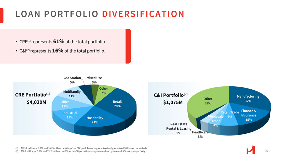 24 LOAN PORTFOLIO DISTRIBUTION Residential Real Estate & Equipment Finance C&I CRE Equipment Finance Residential Real Estate Lines of Credit (2) Term (2) Construction (1) Multifamily Non - owner Occupied Owner Occupied ($ in millions) $408 $1,050 $496 $579 $14 $474 $2,637 $905 Total Balance $0.04 $0.57 $0.89 $0.48 $3.44 $3.02 $3.20 $1.27 Average $0.03 $0.46 $0.19 $0.06 $2.97 $1.13 $1.22 $0.39 Median $224 $474 $411 $522 $7 $342 $1,861 $689 Top Quintile Balance (3) $0.1 or more $0.8 or more $0.9 or more $0.2 or more $5.3 or more $3.0 or more $3.9 or more $1.3 or more Top Quintile Loan Size $0.12 $1.29 $4.57 $2.18 $7.18 $10.68 $11.35 $4.85 Top Quintile Average $0.09 $0.97 $2.02 $0.42 $7.18 $5.16 $7.95 $2.58 Top Quintile Median (1) Represents the total outstanding amount. Advances require authorization and disbursement requests, depending on the progress of the project and inspections. Advances are non - revolving and are made throughout the term, up to the original commitment amount (2) Term loans are a commitment for a specified term. Majority of the Lines of Credit are revolving, including commercial revolvers, with some non - revolvers (sub - notes and working capital tranches) (3) Top quintile represents top 20% of the loans