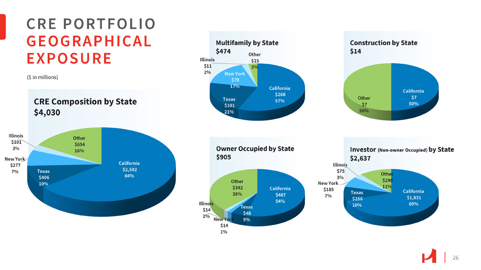 LOAN PORTFOLIO DIVERSIFICATION (1) $115.7 million, or 2.9%, and $32.5 million, or 0.8%, of the CRE portfolio are unguaranteed and guaranteed SBA loans, respectively (2) $62.9 million, or 5.8%, and $52.7 million, or 4.9%, of the C&I portfolio are unguaranteed and guaranteed SBA loans, respectively Retail 28% Hospitality 21% Industrial 13% Office 12% Multifamily 11% Gas Station 5% Mixed Use 3% Other 7% CRE Portfolio (1) $4,030M Manufacturing 32% Insurance 15% Retail Trade Finance & Wholesale 6% Trade 4% Healthcare 3% Real Estate Rental & Leasing 2% Other 38% C&I Portfolio (2) $1,075M • CRE (1) represents 61% of the total portfolio • C&I (2) represents 16% of the total portfolio. 25
