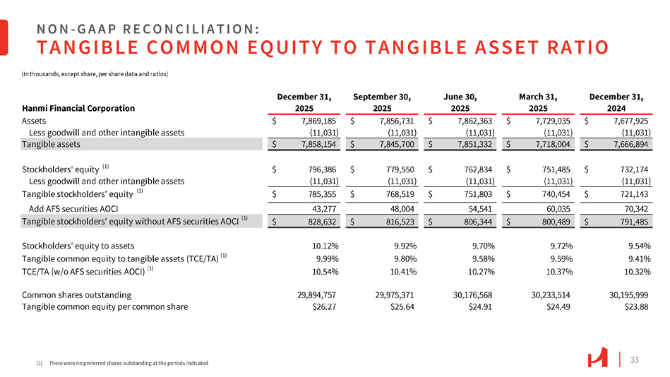 33 NON - G A A P R E C O N C I L I A T I O N : TANGIBLE COMMON EQUITY TO TANGIBLE ASSET RATIO (1) There were no preferred shares outstanding at the periods indicated December 31, March 31, June 30, September 30, December 31, 2024 2025 2025 2025 2025 Hanmi Financial Corporation 7,677,925 $ 7,729,035 $ 7,862,363 $ 7,856,731 $ 7,869,185 $ Assets (11,031) (11,031) (11,031) (11,031) (11,031) Less goodwill and other intangible assets $ 7,666,894 $ 7,718,004 $ 7,851,332 $ 7,845,700 $ 7,858,154 Tangible assets 732,174 $ 751,485 $ 762,834 $ 779,550 $ 796,386 $ Stockholders' equity (1) (11,031) (11,031) (11,031) (11,031) (11,031) Less goodwill and other intangible assets 721,143 $ 740,454 $ 751,803 $ 768,519 $ 785,355 $ Tangible stockholders' equity (1) 70,342 60,035 54,541 48,004 43,277 Add AFS securities AOCI $ 791,485 $ 800,489 $ 806,344 $ 816,523 $ 828,632 Tangible stockholders' equity without AFS securities AOCI (1) 9.54% 9.72% 9.70% 9.92% 10.12% Stockholders' equity to assets 9.41% 9.59% 9.58% 9.80% 9.99% Tangible common equity to tangible assets (TCE/TA) (1) 10.32% 10.37% 10.27% 10.41% 10.54% TCE/TA (w/o AFS securities AOCI) (1) 30,195,999 30,233,514 30,176,568 29,975,371 29,894,757 Common shares outstanding $23.88 $24.49 $24.91 $25.64 $26.27 Tangible common equity per common share (In thousands, except share, per share data and ratios)