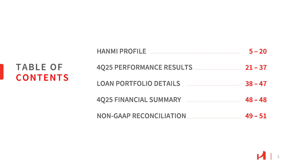 2 TABLE OF CONTENTS HANMI PROFILE 5 – 20 4Q25 PERFORMANCE RESULTS 21 – 37 LOAN PORTFOLIO DETAILS 4Q25 FINANCIAL SUMMARY NON - GAAP RECONCILIATION 49 – 51 38 – 47 48 – 48
