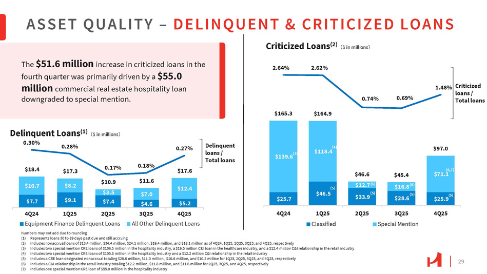 29 $7.7 $9.1 $5.2 $10.7 $8.2 $12.4 $18.4 $17.3 $10.9 $3.5 $7.4 $11.6 $7.0 $4.6 $17.6 0.30% 0.28% 0.17% 0.18% 0.27% 3Q25 4Q25 All Other Delinquent Loans 4Q24 1Q25 2Q25 Equipment Finance Delinquent Loans Numbers may not add due to rounding ASSET QUALITY – DELINQUENT & CRITICIZED LOANS Delinquent loans / Total loans $118.4 $165.3 $164.9 $97.0 2.64% 2.62% 0.74% 0.69% 1.48% Criticized loans / Total loans $139.6 (3) (1) Represents loans 30 to 89 days past due and still accruing (2) Includes nonaccrual loans of $13.4 million, $34.4 million, $24.1 million, $19.4 million, and $18.1 million as of 4Q24, 1Q25, 2Q25, 3Q25, and 4Q25, respectively (3) Includes two special mention CRE loans of $106.5 million in the hospitality industry, a $19.5 million C&I loan in the healthcare industry, and a $12.4 million C&I relationship in the retail industry (4) Includes two special mention CRE loans of $105.8 million in the hospitality industry and a $12.2 million C&I relationship in the retail industry (5) Includes a CRE loan designated nonaccrual totaling $20.0 million, $11.0 million , $10.6 million, and $10.2 million for 1Q25, 2Q25, 3Q25, and 4Q25, respectively (6) Includes a C&I relationship in the retail industry totaling $12.2 million, $11.8 million, and $11.6 million for 2Q25, 3Q25, and 4Q25, respectively (7) Includes one special mention CRE loan of $55.0 million in the hospitality industry (4) (6,7) $71.1 $25.9 (5) $45.4 $16.8 (6) (5) $28.6 $46.6 $12.7 (6) $33.9 (5) (5) $46.5 $25.7 4Q25 3Q25 Special Mention 2Q25 1Q25 Classified 4Q24 The $51.6 million increase in criticized loans in the fourth quarter was primarily driven by a $55.0 million commercial real estate hospitality loan downgraded to special mention. Delinquent Loans (1) 㸦 $ in millions 㸧 Criticized Loans (2) 㸦 $ in millions 㸧