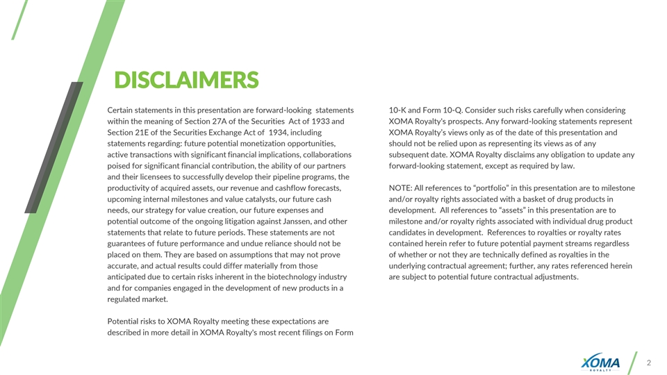 DISCLAIMERS Certain statements in this presentation are forward-looking statements 10-K and Form 10-Q. Consider such risks carefully when considering within the meaning of Section 27A of the Securities Act of 1933 and XOMA Royalty's prospects. Any forward-looking statements represent Section 21E of the Securities Exchange Act of 1934, including XOMA Royalty’s views only as of the date of this presentation and statements regarding: future potential monetization opportunities, should not be relied upon as representing its views as of any active transactions with significant financial implications, collaborations subsequent date. XOMA Royalty disclaims any obligation to update any poised for significant financial contribution, the ability of our partners forward-looking statement, except as required by law. and their licensees to successfully develop their pipeline programs, the productivity of acquired assets, our revenue and cashflow forecasts, NOTE: All references to “portfolio” in this presentation are to milestone upcoming internal milestones and value catalysts, our future cash and/or royalty rights associated with a basket of drug products in needs, our strategy for value creation, our future expenses and development. All references to “assets” in this presentation are to potential outcome of the ongoing litigation against Janssen, and other milestone and/or royalty rights associated with individual drug product statements that relate to future periods. These statements are not candidates in development. References to royalties or royalty rates guarantees of future performance and undue reliance should not be contained herein refer to future potential payment streams regardless placed on them. They are based on assumptions that may not prove of whether or not they are technically defined as royalties in the accurate, and actual results could differ materially from those underlying contractual agreement; further, any rates referenced herein anticipated due to certain risks inherent in the biotechnology industry are subject to potential future contractual adjustments. and for companies engaged in the development of new products in a regulated market. Potential risks to XOMA Royalty meeting these expectations are described in more detail in XOMA Royalty's most recent filings on Form 2