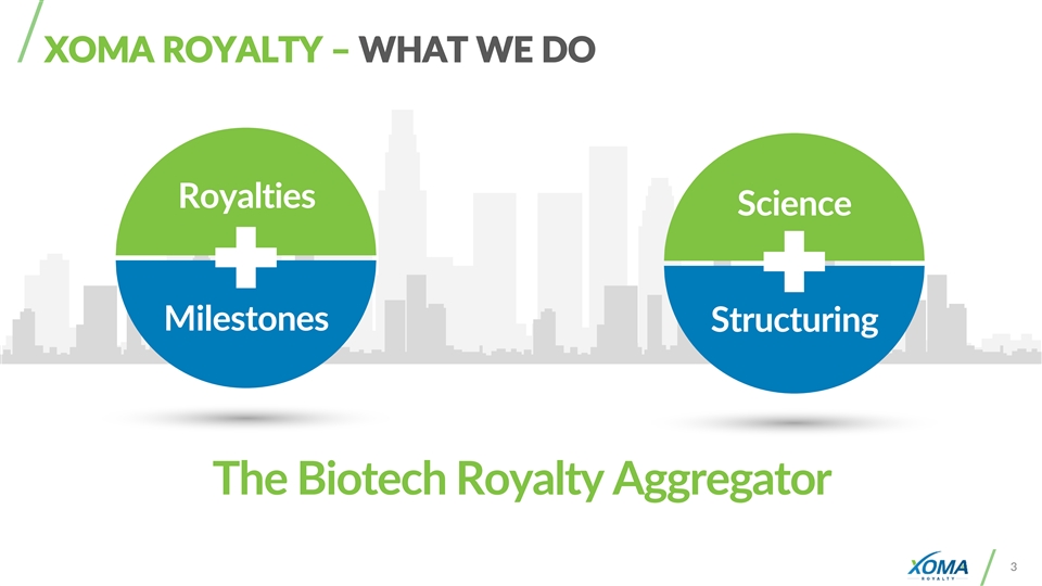 XOMA ROYALTY – WHAT WE DO Royalties Science Milestones Structuring The Biotech Royalty Aggregator 3